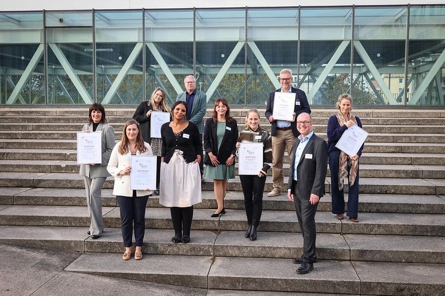 Ende Oktober 2023 erhielten sechs Unternehmen aus Düsseldorf und dem Kreis Mettmann im Bürgerhaus Bilk das Zertifikat „Hier ausgezeichnet arbeiten“. Das vom Kompetenzzentrum Frau und Beruf und der IHK Düsseldorf ins Leben gerufene Qualitätssigel zeichnet Unternehmen mit einer vorbildhaften personal- und familienorientierten Unternehmenskultur aus. Zu den ausgezeichneten Unternehmen gehören die Konecranes GmbH, QBE Europe SA/NV Direktion für Deutschland und die Werkstatt für angepasste Arbeit GmbH mit Sitz in Düsseldorf. Aus dem Kreis Mettmann wurden die AAC Kabelbearbeitungssysteme GmbH aus Heiligenhaus, die August Bertram GmbH & Co. KG aus Hilden und die BLF Holding GmbH & Co. KG aus Velbert geehrt. Zudem werden sieben Betriebe für ihre Re-Zertifizierung geehrt, weil sie weiter nachhaltig an ihrer Familien- und Personalorientierung gearbeitet haben. „Flexible Arbeitszeiten, betriebliche Angebote zur Kinderbetreuung, familienbewusste Führung sowie personalorientierte Zusatzleistungen – das sind nur einige Beispiele für Maßnahmen, die ein Unternehmen attraktiv für Mitarbeitende machen“, sagte Dr. Nikolaus Paffenholz, Abteilungsleiter Unternehmensservice der IHK Düsseldorf. Und das hilft den Betrieben: Denn personal- und familienorientierte Rahmenbedingungen sorgen für motivierte Mitarbeitende, geringere Personalausfälle und neue Fachkräfte. Johanna Torkuhl, Leiterin vom Kompetenzzentrum Frau und Beruf Düsseldorf und Kreis Mettmann (Competentia) betont: „Ausgezeichnete Unternehmen werden in Bewerbungsgesprächen gezielt nach dem Zertifikat gefragt. Für uns ist dies der beste Beleg, dass es sich für Betriebe wirklich lohnt, die Herausforderung anzunehmen.“ Für den Erhalt des Zertifikats unterziehen sich die Unternehmen einem Selbstcheck. Dann erfahren sie in Workshops und im Austausch mit anderen Betrieben, wie sie die Rahmenbedingungen für ihr Personal noch weiter verbessern können. Dabei wurden sie individuell vor Ort beraten und präsentierten abschließend ihre Maßnahmen vor der Jury, die aus Akteuren der regionalen Wirtschaft besteht. Für die Re-Zertifizierung stellen sich die Unternehmen nach zwei Jahren erneut der Jury. Diese prüft, ob die vereinbarten Ziele bei der Personalarbeit versiert verfolgt wurden.