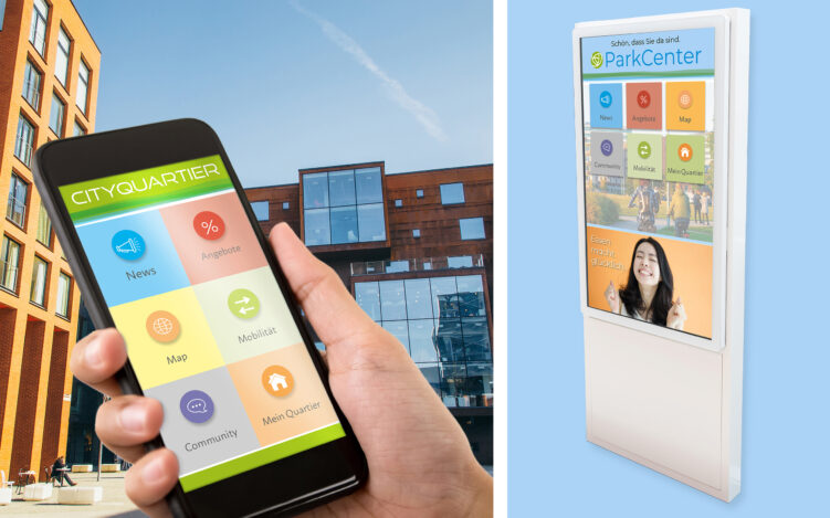 Alle und alles in der App: Infos, Angebote, Services, Termine, News, Wayfinding und Digitale Terminals vor Ort bieten interaktive Informationen rund um Quartier und Community