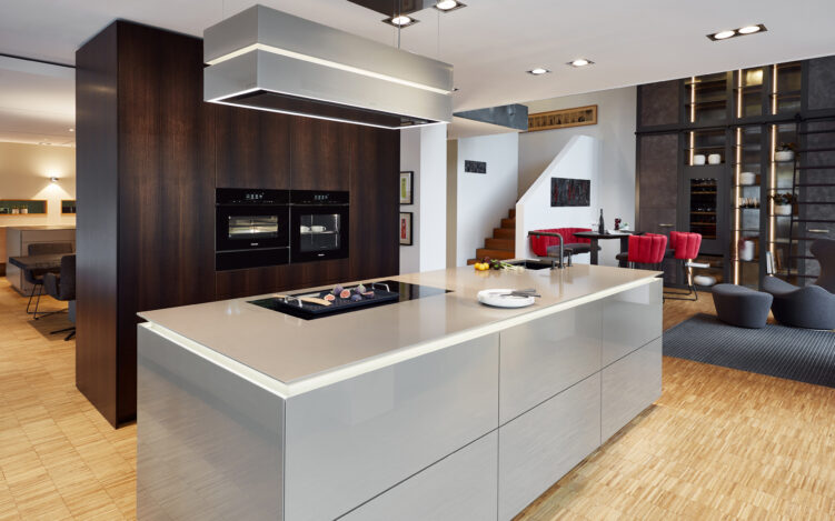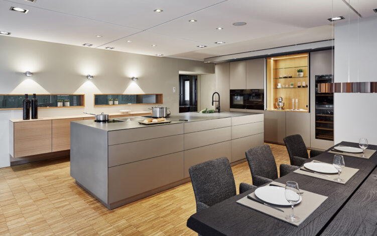 Ein sehr gutes Beispiel für diesen Manufaktur-Anspruch des Familienunternehmens ist die Eigenmarke „Thelen 1726“, ein Premium-Küchenkonzept, das alle Wünsche nach Individualität wahr werden lässt. Hier fließen mehr als 50 Jahre Know-how im Premium-Küchensegment ein: „Wir beginnen da, wo die Möglichkeiten der Möbelindustrie aufhören“, beschreiben die Thelens den selbst gesteckten Qualitätsanspruch. Hier entspricht nichts der Norm vorgefertigter Standardgrößen. Jede Höhe, Breite oder Tiefe kann flexibel bestimmt werden und auf Wunsch werden die hochwertigsten Materialien in der eigenen Schreinerei in Handarbeit verarbeitet, wie z.B. das edle Poltrona-Leder, das sonst in italienischen Sportwagen-Klassikern verarbeitet wird. Schubkästen aus Aluminium oder mit hochwertigen Holzfurnieren belegt oder aber ganz besonders stauraumfreundliche Schranklösungen sind weitere Beispiele für die große Liebe zum Detail, die hier an der Tagesordnung ist. Und da sich die Thelens auch jederzeit Gedanken um eine möglichst ressourcenschonende Produktion machen, werden z.B. Farben auf Wasserlackbasis verwendet, und den Strom produzieren Sonnenkollektoren auf dem eigenen Dach.