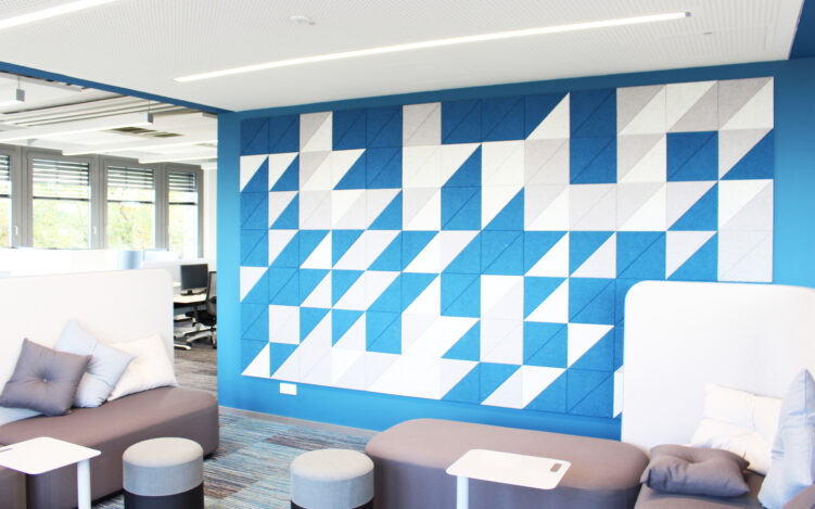 Bei der Konzeptentwicklung wurden die künftigen Nutzer in einer intensiven Workshop-Phase mit einbezogen, um eine hohe Mitarbeiter-Zufriedenheit zu erreichen und gleichzeitig ein effizientes Konzept für neue Arbeitswelten umzusetzen. Heutzutage sitzen Verwaltungsmitarbeiter nicht mehr in Doppel- oder Einzelbüros, sondern man teilt sich in einem Kombibüro separierte Work Spaces und hat gemeinsame nutzungsspezifische Bereiche in der Mittelzone. Entsprechend folgt die Arbeitsplatzgestaltung auch hier diesem Leitgedanken. Grundsätzlich bekommt jeder Mitarbeiter einen festen Arbeitsplatz im Backoffice-Bereich, wobei die Anordnung der einzelnen Tischgruppen mit Abtrennungen durch Möblierung und Glaswände für separierte Arbeitsbereiche sorgt. Hier wurde Teppichboden verlegt, der den Trittschall schluckt. Weitere Schallabsorber sind vollflächig wirksame Akustikdecken sowie für jeden Arbeitsplatz abgehängte Akustiksegel, die zudem auch die Funktion haben, für eine dreidimensionale Raumgliederung zu sorgen. Farbig gestaltete Leichtbauplatten und Schallabsorber mit Filzoberfläche runden das Akustik-Konzept punktuell ab.