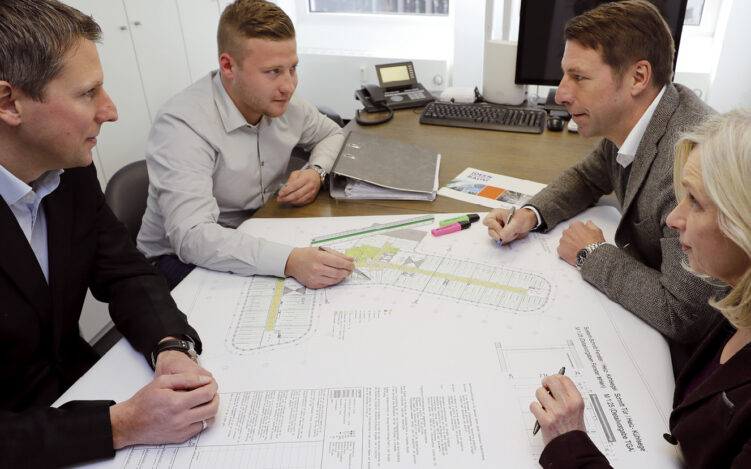 Gemeinsam besprechen die Geschäftsführer mit Bauleiter Jerome Lange (2.v.l.) und Innenarchitektin Jule Poensgen das nächste Projekt