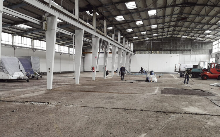 Während manch ein Mitbewerber an pandemiebedingt geschlossenen Grenzen scheiterte, waren die vergangenen Monate für das in Lage ansässige Logistik-Unternehmen Skyline Express International besonders arbeitsreich. „Unsere Auftragsbücher sind voll“, kann Geschäftsführer Volker Sim resümieren. „Dank unserer internationalen Kontakte konnten wir unkonventionelle neue Wege finden, die Güter pünktlich von A nach B zu bringen. Wichtiger Teil unseres Rundum-Services ist, dass wir schwierige Fracht auch unverpackt annehmen und sie hier vor Ort ‚ready for carriage‘ machen. Gefahrgüter und Schwerlasten strapazieren dabei natürlich auf lange Sicht den Untergrund. Glücklicherweise hatten wir uns vergangenen Oktober für eine Sanierung des Hallenbodens entschieden.“ Zeit ist Geld in der Logistik-Branche, und wenn das Verpacken und Umladen davon geprägt ist, dass man beschädigte Stellen im Boden der Logistikhalle umfahren muss oder andernfalls riskiert, dass Fahrzeuge und Ladungen beschädigt werden, ist das kontraproduktiv. Mit der EICHHORN GmbH, die über 40 Jahre Erfahrung im Sanieren von Industrieböden verfügt, hatte sich das Logistik-Unternehmen genau den richtigen Partner gesucht. EICHHORN-Geschäftsführer Marc Frenzel: „Unsere Kunden verbindet eigentlich alle, dass sie nicht einfach den laufenden Betrieb ruhen lassen können, weil ein Boden saniert werden muss und die Halle damit vorübergehend unbenutzbar wird. Zeitnah und in enger Abstimmung zu arbeiten haben wir daher zur Kernkompetenz entwickelt. Bei der Skyline Express GmbH gab es mehrere Herausforderungen zu bewältigen: Der vorhandene Betonboden war durch die jahrelange Schwerlastnutzung stark beschädigt. Folgerichtig brauchte der Bauherr für die Zukunft eine hochabriebfeste Oberfläche, die gleichzeitig sehr eben ist und den Belastungen durch Schwerlaststapler und ständigen Warenumschlag standhält. Hier kam unser bewährter Partner, die VELOSIT GmbH ins Spiel.“ Wie Heinzelmännchen können seine 16 Mitarbeiter agieren. Da das Unternehmen vorwiegend Industriebetriebe als Kunden hat, ist es wichtig, möglichst minimalinvasiv zu sanieren.