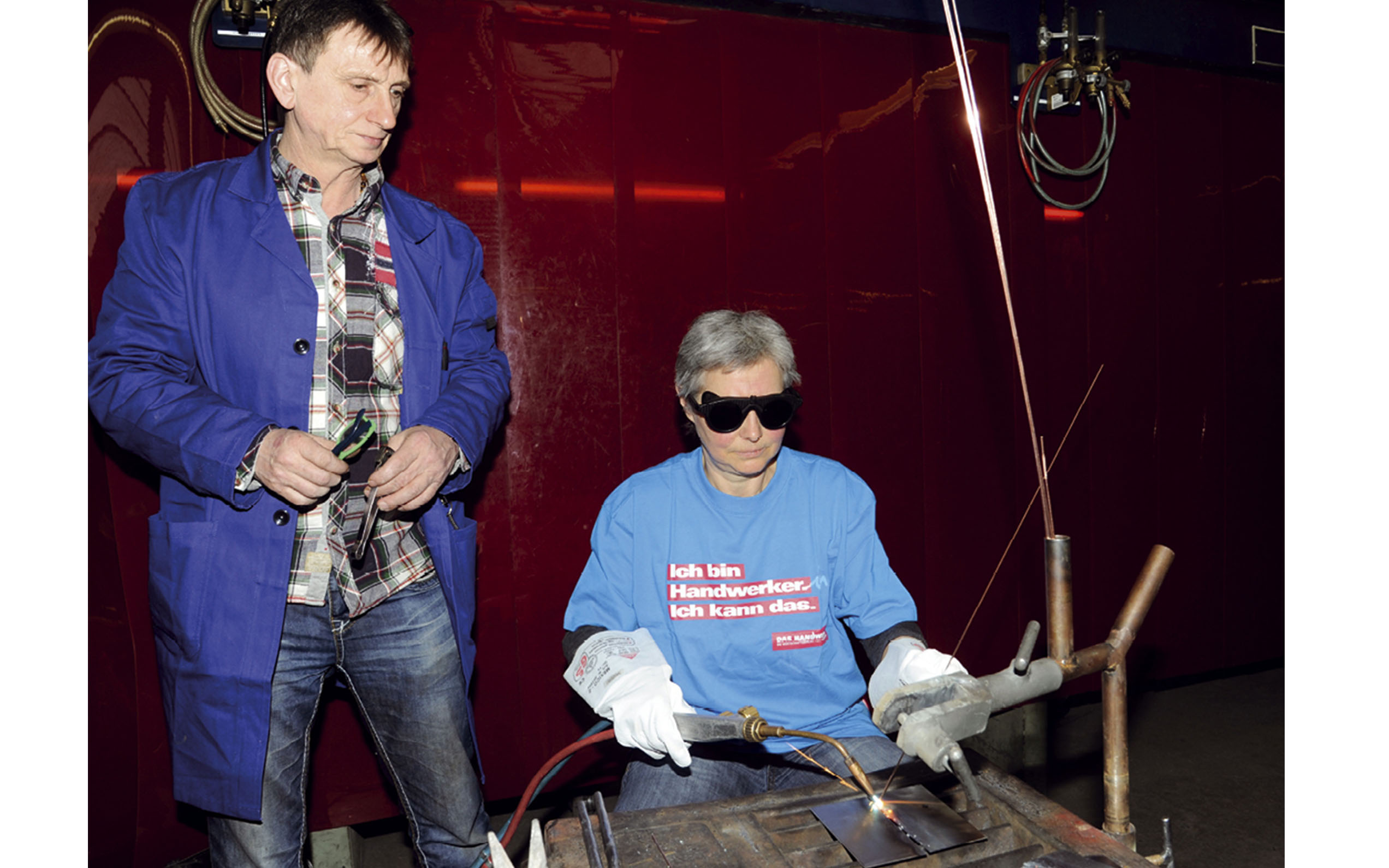 Else Schnakenberg sieht man ihren Spaß beim Schweißen deutlich an. Sie hat für diesen Tag die richtige Entscheidung getroffen und sich zum Schnupperkurs angemeldet. Beim Praxistag „Frauen im Handwerk“ darf sie im Bildungszentrum BGE Aachen der Handwerkskammer ihr Talent testen. Das Schweißen unter Anleitung von Ausbilder Wolfgang Schaffrath klappt auch schon ganz gut. Den Praxistag veranstaltet die Kammer nach der erfolgreichen Premiere 2017 bereits zum zweiten Mal. In Kooperation mit dem Fachausschuss Frau und Arbeit im Frauennetzwerk Aachen hat sie Frauen eingeladen, sich in Metallbau, Elektronik, Anlagenmechanik, Malerhandwerk oder Schweißen auszuprobieren. Die Teilnehmerinnen fertigen ein Werkstück, das sie am Ende des Tages mitnehmen dürfen. Während der Arbeit werden die Frauen von Ausbildungsmeistern der Kammer sowie Mitarbeitern des Jobcenters und der Agentur für Arbeit begleitet. Sie beantworten Fragen zu Weiterbildung, Umschulung, Karrierechancen und anderen Themen. Bei ihrem Besuch im Bildungszentrum BGE treffen die Teilnehmerinnen auch andere Frauen, die sich im Handwerk behaupten können und noch viel vorhaben. Sie sind Beispiele dafür, dass auch Frauen in einst typischen Männerberufen gute Arbeit leisten. Für den Wirtschaftszweig Handwerk, der sehr unter dem Fachkräftemangel leidet, sind Frauen eine sehr wichtige Zielgruppe. Einblicke ins Handwerk gewähren, Berufsperspektiven aufzeigen – das sind die vorrangigen Ziele des Praxistages, den Stefanie Horn, Sozialarbeiterin bei der QualiTec GmbH, einer Tochtergesellschaft der Handwerkskammer, mit ihrem Team organisiert hat.