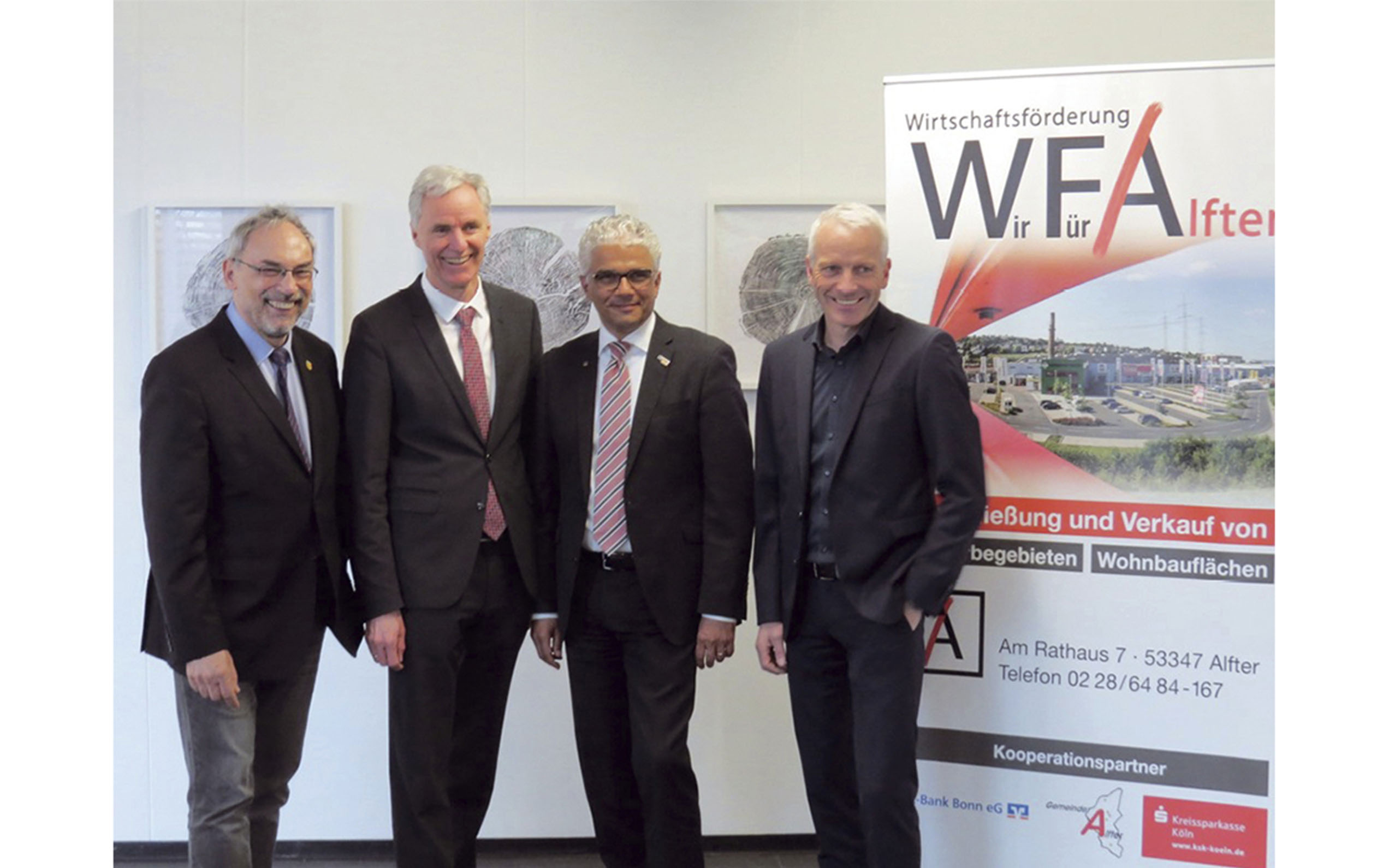 Das Gewerbegebiet Alfter Nord soll als Standort für einen ausgewogenen Branchenmix aus Industrie, Handwerk und Handel positioniert werden. Dabei planen die Gemeinden Alfter, Bornheim und Bonn die Gründung einer kommunalen Arbeitsgemeinschaft und legten jetzt den Grundstein für die interkommunale Zusammenarbeit. Ziel ist es, ansässige Unternehmen in der Region zu binden und neue Betriebe zu gewinnen. In der engen Zusammenarbeit sehen die Kommunen die Möglichkeit, immer knapper werdende Gewerbeflächen regional anzubieten. Auch könnten dadurch alle drei Gemeinden an dem Flächenangebot teilhaben. Im Fokus steht die gemeinsame Weiterentwicklung des Gewerbegebietes Alfter Nord. Das Gebiet verfügt über hervorragende Verkehrsanbindungen, um die umliegende Region zu erschließen. Hier finden Unternehmen optimale Bedingungen für Produktion, Innovation und Wachstum. Allerdings sind alle bisher zur Verfügung stehenden Flächen auf Alfterer Gebiet bereits vermarktet. Die Nachfrage übersteigt das Angebot. Durch die Weiterentwicklung des Areals um rund 30 Hektar könne jedoch zumindest mittelfristig der Bedarf gedeckt werden. Damit werden vorhandene Arbeitsplätze erhalten und neue geschaffen. Die Gründung einer kommunalen Arbeitsgemeinschaft zwischen Alfter, Bornheim und Bonn wird nun den kommunalen Gremien zur Beschlussfassung vorgelegt. Die Arbeitsgemeinschaft soll ihren Mitgliedern Anregungen geben, jedoch keine Beschlüsse für die Mitglieder fassen können. Gleichzeitig eigne sich diese Kooperation für eine unbürokratische Umsetzung des Projekts, auch könnten die Gewerbeflächen gemeinsam unter einer Dachmarke vermarktet werden. Die Wirtschaftsförderung Alfter (WFA) nimmt gemeinsam mit dem Fachbereich Planen, Entwickeln, Bauen der Gemeinde Alfter die operative Projektentwicklung vor und treibt die Bodenordnung intensiv voran. Aufgrund dessen obliegt ihr ein letztes Entscheidungsrecht bei der Ansiedlung von Unternehmen.