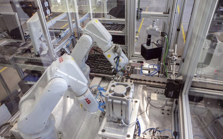 Die Fertigung der Spritzgussteile ist auch durch den Einsatz von Roboterarmen automatisiert (Foto: Kimberly Wittlieb)
