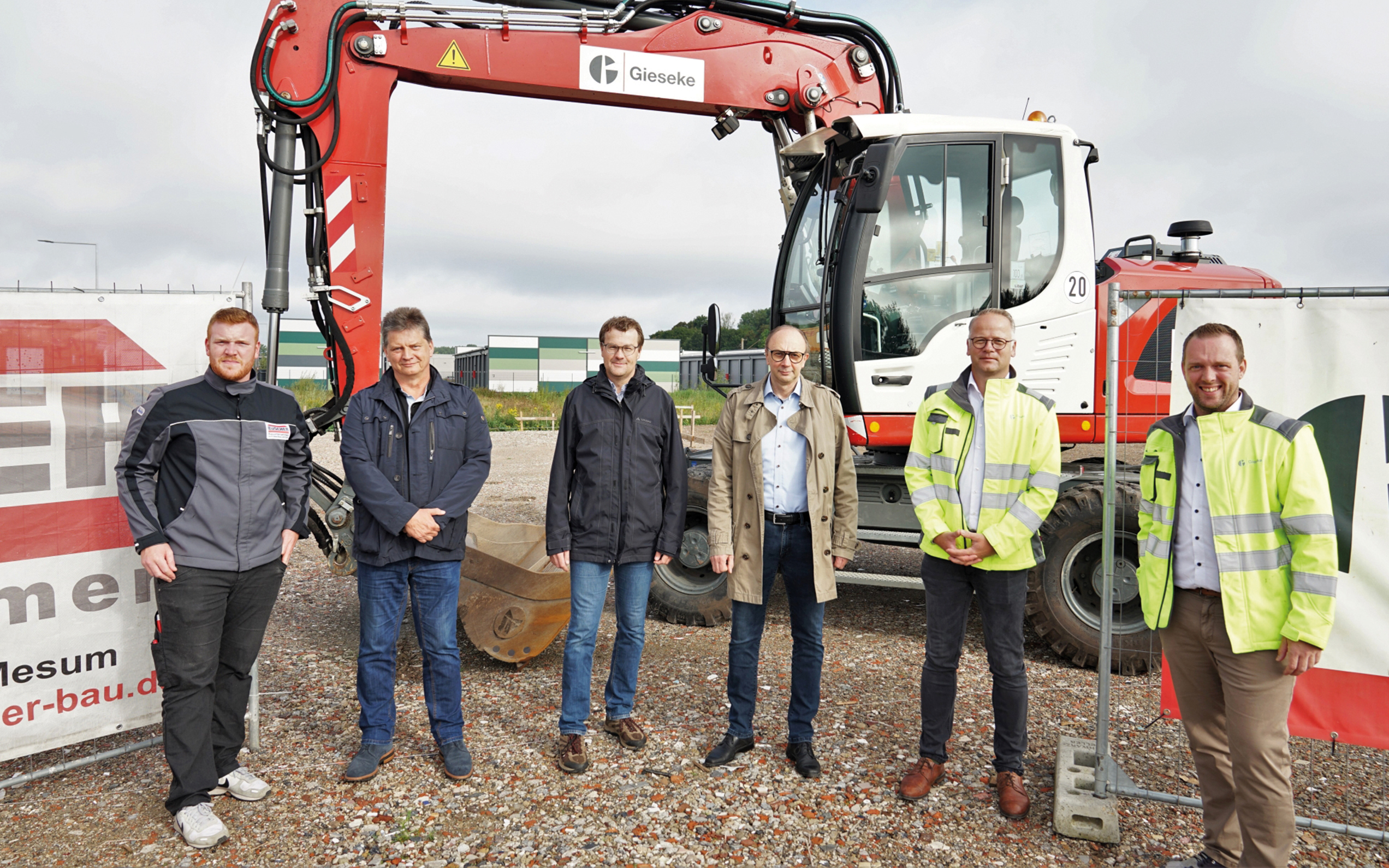 Mit dem Bauunternehmen Büscher wird ein weiteres Unternehmen aus Rheine einen neuen Standort auf den Flächen des ehemaligen Rangierbahnhofes, Rheine R, beziehen. Schwerpunkte des Unternehmens sind der Hochbau von Ein- und Mehrfamilienhäusern sowie von Industrieobjekten und Kommunalbauten. Vor Beginn der Bauarbeiten trafen sich die beteiligten Unternehmen vor Ort und stellten das Projekt vor. Auf dem knapp 3.500 Quadratmeter großen Grundstück wird ein zweigeschossiger Verwaltungstrakt mit angeschlossener Lagerhalle entstehen. „Der neue Standort gibt uns die Möglichkeit, unsere Betriebsabläufe zu optimieren und bietet zudem Raum für das angestrebte Unternehmenswachstum”, erläutert Norbert Steingröwer, seit 2008 geschäftsführender Gesellschafter von Büscher. Ganz bewusst habe man sich dabei für ein Investorenprojekt entschieden und mit der Firma Gieseke einen Investor mit ins Boot geholt, der das Grundstück an das Unternehmen langfristig vermietet. Nach dem Planungsprozess hat die Planungsgruppe Mesum mit Inhaber und Architekt Wilhelm Bökenkamp eine Gesamtkonzeption des Bauprojektes entwickelt, die in den kommenden Monaten umgesetzt wird. Der neue Standort soll im Frühjahr 2022 bezugsfertig sein. Büscher ist das 15. Unternehmen, das in dem Gewerbegebiet eine neue Heimat findet. Aktuell sind knapp zwei Drittel der Flächen vermarktet. Weitere Flächen sind reserviert. „Die Planungen sind zum Teil schon sehr weit fortgeschritten, sodass wir noch mit dem einen oder anderen Vertragsschluss rechnen“, sagt André Reinke von der Entwicklungs- und Wirtschaftsförderungsgesellschaft für Rheine (EWG) Rheine.