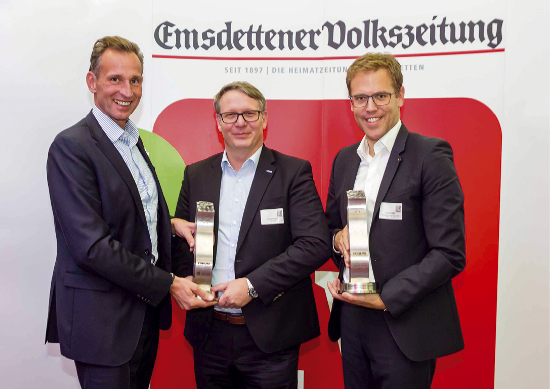 Die Handwerkskooperation Raumfabrik Münster/Osnabrück und die Wedi GmbH als Systemanbieter sind „Emsdettens Unternehmen des Jahres 2018“. Beim 26. „Großen Forum!“ am 19. November 2018 wurden die begehrten Preise, die alle zwei Jahre vom Netzwerk Forum „…wir unternehmen was!“ und der Emsdettener Volkszeitung vergeben werden, vor 140 Gästen überreicht. In der Kategorie „Bis 25 Beschäftigte“ wurde die Raumfabrik Münster/Osnabrück GmbH & Co. KG, in der Kategorie „Ab 25 Beschäftigte“ die Wedi GmbH ausgezeichnet. Laudator Jürgen B. Schmidt verdeutlichte, warum die Raumfabrik diesen Preis verdient hat. Eine auf Dauer angesetzte Handwerkerkooperation mit außergewöhnlichen Servicegedanken im neuen Konzept „Mission Geiles Handwerk“ strahlt weit über die Grenzen Emsdetten hinaus. Marketing einfach anders gedacht und mit sehr hoher Professionalität umgesetzt – dafür steht die Raumfabrik, mit vielen weiteren Mitglieds-Handwerksunternehmen aus Emsdetten, die gemeinsam für Qualität und Service aus einer Hand stehen. Außergewöhnlich ist auch die Wedi GmbH, die mit 35 Jahren Geschichte als Familienunternehmen eine rasante Unternehmensentwicklung abgeliefert hat. Mittlerweile über 500 Mitarbeitern bietet der Innovationsführer Wedi einen sicheren und attraktiven Arbeitsplatz, wie Laudator Jörg Ortmeier erklärte. Wedis Welt ist die Welt der Handwerker, die „Wedi-Bauplatte“ mittlerweile ein internationaler Fachbegriff. Die Branche kennt die direkt verfliesbaren Baustoffe, die bodengleichen Duschelemente und Designmodule von Wedi, die für Wellness, Lebensgefühl, Vielfalt, Einfachheit, Sicherheit und höchste Qualität stehen. So manche Wellnessoase mit Wedi-Produkten findet sich in vielen Haushalten wieder. Die Forum!-Initiatoren möchten mit dem Wirtschaftspreis Unternehmen aus Emsdetten für ihre außergewöhnlichen Leistungen ehren. Die Preisträger sind Botschafter von Emsdetten und sollen den starken Wirtschaftsstandort widerspiegeln.