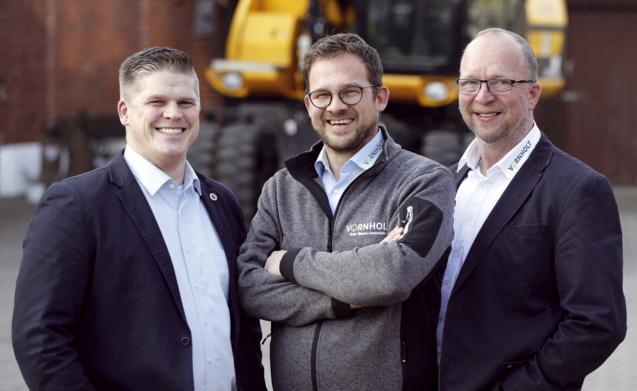 Basis der täglichen Arbeit ist bei VORNHOLT die Erde. Bei fast allen Landschaftsbauprojekten muss der Boden fachgerecht vorbereitet werden, damit weitere Maßnahmen durchgeführt werden können. Je größer das Projekt, desto aufwendiger auch die Erdbewegungen. Genau hier haben die Experten besonders viel Spaß. Denn die Realisierung von großen Projekten gehört für sie einfach dazu und ist wichtiger Bestandteil ihrer täglichen Arbeit auf den Baustellen der Region. Auch im Gewässerbau haben sich die Spezialisten aus Borken einen überregionalen Namen gemacht. Es gibt nur wenige Unternehmen, die sowohl langjährige Erfahrungen wie auch Erfolge in der Gewässersanierung und Renaturierung vorweisen können. „Als eines der wenigen Unternehmen im Landschaftsbau bieten wir auch ökologische Maßnahmen im Gewässerbau an“, erklärt Christoph Vornholt, der von seinem Kollegen Bernhard Terhan und dem Prokuristen Sven Brörken in der Geschäftsführung unterstützt wird. Darauf ist man natürlich sehr stolz. Die ständige Weiterentwicklung des Unternehmens in der Qualitätsverbesserung lässt sich auch an „ÖKOPROFIT“ festmachen, nach dem das Unternehmen 2017 von der Wirtschaftsförderungsgesellschaft (WFG) des Kreises Borken zertifiziert wurde. Dabei handelt es sich um ein ökologisches Kooperationsprojekt für integrierte Umwelttechnik, in dem die WFG, der Kreis Borken und die VORNHOLT GmbH eng zusammenarbeiten.