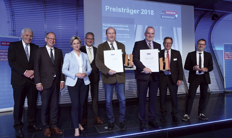 Eine Kundenanfrage brachte Hubertus Haking, Geschäftsführer der Ladberger Haking Metallbau GmbH, auf die Idee, eine per Fernsteuerung zu bedienende Markise für Rundbogen- und Segment-Fenster zu entwickeln. Mittels Seilzug wird die innovative Markise bewegt, wobei von der Technik nichts zu sehen ist. Bald war auch die Handwerkskammer Münster an dem Projekt beteiligt, deren Innovationsberater Hans-Dieter Weniger den Kontakt zu Prof. Dr. Klaus Baalmann von der Fachhochschule Steinfurt vermittelte. „Die Entwicklungsarbeiten dauerten etwa ein Jahr an, bis die Markise dann in die Produktion gehen konnte“, berichtet Geschäftsführer Haking. Ein denkmalgeschütztes Kloster in Bayern war der erste Kunde, der die Rundbogen-Markisen aus dem Hause Haking erhalten hat. Für die innovative Entwicklung wurde der Haking Metallbau GmbH Mitte Juli in Stuttgart der bundesweit ausgeschriebene Seifriz-Preis 2018 verliehen, der seit über 25 Jahren erfolgreiche Kooperationen zwischen Handwerk und Wissenschaft prämiert. Anlässlich der hohen Auszeichnung besuchte Ende Juli Anja Karliczek, Bundesministerin für Bildung und Forschung, das Unternehmen, um sich die Entwicklung persönlich vorführen zu lassen. „Es ist doppelt schön, weil in meinem Wahlkreis so innovative Firmen sind und die Zusammenarbeit zwischen Theorie und Praxis, Fachhochschule und Unternehmen, so gut läuft“, freute sich die Bundesministerin und betonte: „Wir müssen bei Innovationen schneller werden, in der gesamten Wirtschaft, um wettbewerbsfähig zu bleiben.“ Deshalb wertet sie es als gut, wenn KMU mit Hochschulen kooperieren. „Wir haben viele gute Denker, aber wir brauchen auch viele gute Tüftler.“ Dass viele von denen im Münsterland heimisch sind, macht die Brochterbeckerin besonders stolz.