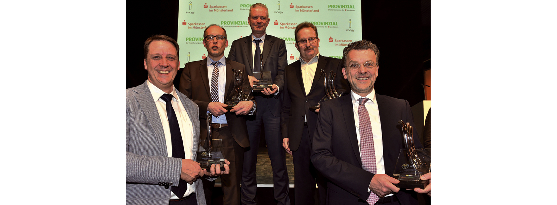 Fünf Preisträger, 15 nominierte Unternehmen und 60 eingereichte Ideen in fünf Kategorien: Der Münsterland e.V. hat am 1. Dezember 2017 den Innovationspreis Münsterland verliehen. „Seit der Premiere des Innovationspreises Münsterland im Jahr 1993 haben wir insgesamt 81 Ideen ausgezeichnet, den Wettbewerb immer mehr weiterentwickelt und ihn dem digitalen Zeitalter angepasst. Wir können sehr stolz auf diesen regionalen und renommierten Preis sein“, sagte Klaus Ehling, Vorstand des Münsterland e.V., anlässlich der feierlichen Preisverleihung vor rund 300 Gästen bei der Bernd Münstermann GmbH & Co. KG in Telgte. Die Vorndieck Dienstleistungs GmbH aus Ibbenbüren erhielt mit ihrer Innovation „Car-Caddy“ den Preis in der Kategorie „Klein und pfiffig“. Für die Innovation „HexelOne XXXL – Hochdruckrohre aus Polyethylen“, wurde die Egeplast International GmbH aus Greven ausgezeichnet. Mit einem speziellen 3D-Konfigurator für Schränke punktete die Schrankwerk.de Dickmänken GmbH aus Rheine. Die Hagemeister GmbH & Co. KG aus Nottuln hat einen Energieklinker entwickelt, durch den die Sonneneinstrahlung nicht nur auf dem Dach genutzt werden kann, sondern auch an der Fassade. Und der Preisträger in der Kategorie „Start-up-Unternehmen“, die Trialog Medical GmbH aus Münster, schafft die klassische schriftliche Dokumentation in der vollstationären Pflege ab. Der Münsterland e.V. vergibt den regionalen Preis alle zwei Jahre gemeinsam mit den Förderern des Wettbewerbs: Den Sparkassen im Münsterland, der Westfälischen Provinzial Versicherung AG und der Innogy SE.