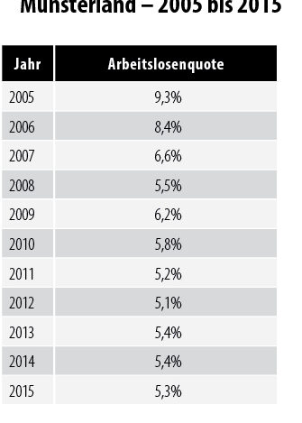 Auch das nördliche Münsterland gilt als starker Standort: “Der Kreis Steinfurt ist eine sehr dynamische Region. Die Zahl der sozialversicherungspflichtig Beschäftigten ist bis Mitte 2016 auf über 150.000 gestiegen. Dieses bedeutet eine Steigerung innerhalb der letzten fünf Jahre um zwölf Prozent“, sagt Birgit Neyer, Geschäftsführerin der Wirtschaftsförderung Steinfurt (WESt). “Unsere mittelständisch geprägten Unternehmen sorgen für nahezu Vollbeschäftigung.“ Starke Branchen seien dabei die Logistik, der Maschinen- und Fahrzeugbau, das Ernährungsgewerbe, die Kunststoff- sowie die Textil- und Bekleidungsindustrie. “Die günstige Lage zwischen den Oberzentren Enschede, Osnabrück und Münster führt dazu, dass innerhalb von acht Stunden ein Markt von circa 135 Millionen Kunden erreichbar ist. Die gute Verkehrsinfrastruktur ergänzen die beiden Binnenschifffahrtswege Dortmund-Ems-Kanal und Mittellandkanal, das gute Eisenbahnnetz sowie der International Airport FMO.“