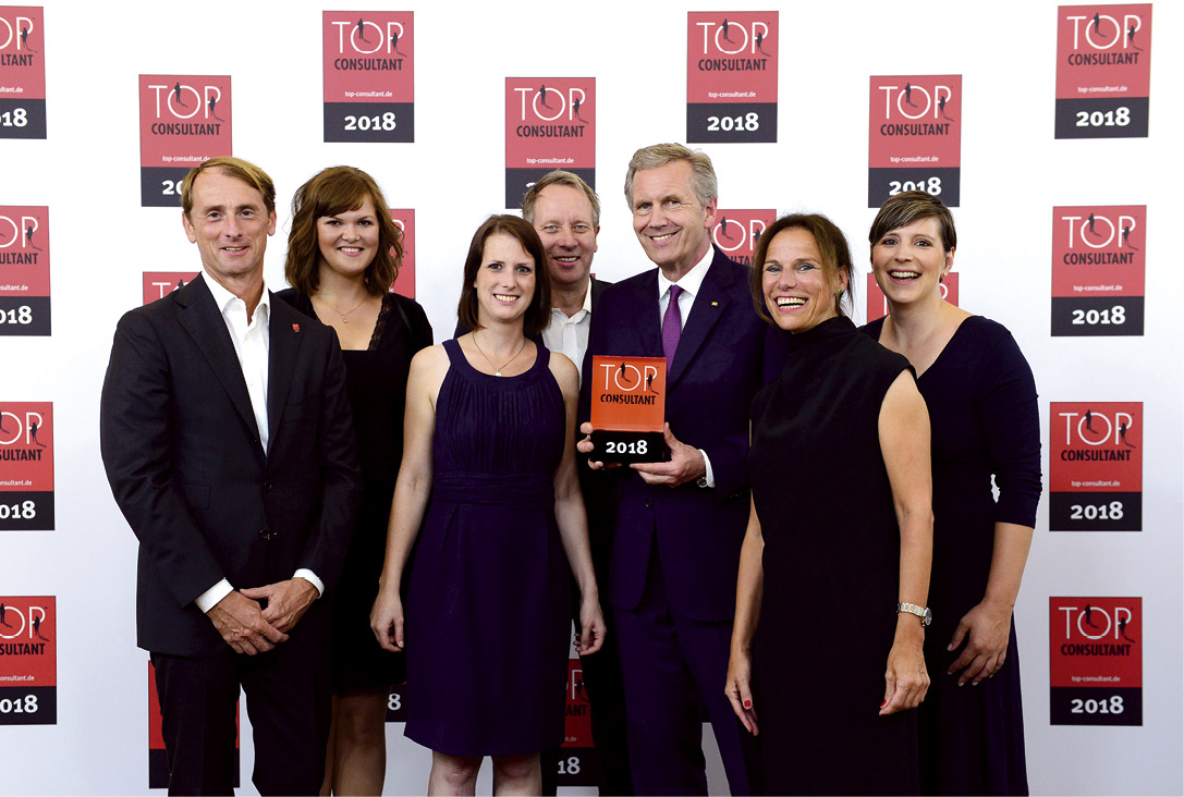 Die Firma Brückel Unternehmensentwicklung aus Münster darf künftig das Qualitätssiegel „Top Consultant“ tragen. Die unabhängige Auszeichnung basiert auf Kundenbefragungen und wird für kundengerechte, mittelstandsorientierte Beraterleistungen verliehen. Inhaberin Manuela Brückel und ihr Team nahmen das Siegel bei der Preisverleihung am 29. Juni in Ludwigsburg vom früheren Bundespräsidenten Christian Wulff entgegen. „Diese Auszeichnung haben wir auf Grundlage der Angaben unserer Kunden erhalten. Sie ist für uns eine Bestätigung unserer Arbeit und macht uns besonders stolz“, sagt Brückel. Die Befragung unter den KMU erfolgt laut Angaben des Veranstalters anhand wissenschaftlicher Kriterien und bewertet die Punkte Kompetenz, Seriosität, Anschlussfähigkeit, Zufriedenheit, Kundenbindung und Weiterempfehlung. Zudem werden Kennzahlen des Beratungsunternehmens wie die Mitarbeiterentwicklung und der berufliche Hintergrund der Beraterinnen und Berater ausgewertet. Dass der Mensch bei Brückel im Mittelpunkt stehe, hoben die Forscher als große Stärke des Unternehmens hervor. „Damit spiegelt das Siegel das wider, worauf auch wir in unserer Beratung den größten Wert legen: Wir möchten die Potenziale der Menschen in einem Unternehmen entwickeln und fördern“, so Brückel weiter. Schwerpunkt des Brückel-Teams aus den Bereichen Psychologie und Wirtschaftspsychologie sowie Betriebswirtschaft ist die Unternehmensentwicklung. Brückel verfolgt dabei einen Ansatz, der Betriebswirtschaft, Organisationsentwicklung und Psychologie zusammenführt. Die Berater bereiten u.a. Unternehmensnachfolgen vor und begleiten diese. Der interdisziplinäre Ansatz bietet laut Angaben von Brückel gerade im Bereich der Nachfolge Mehrwerte für Unternehmer und Unternehmen.