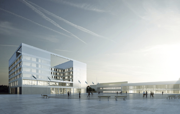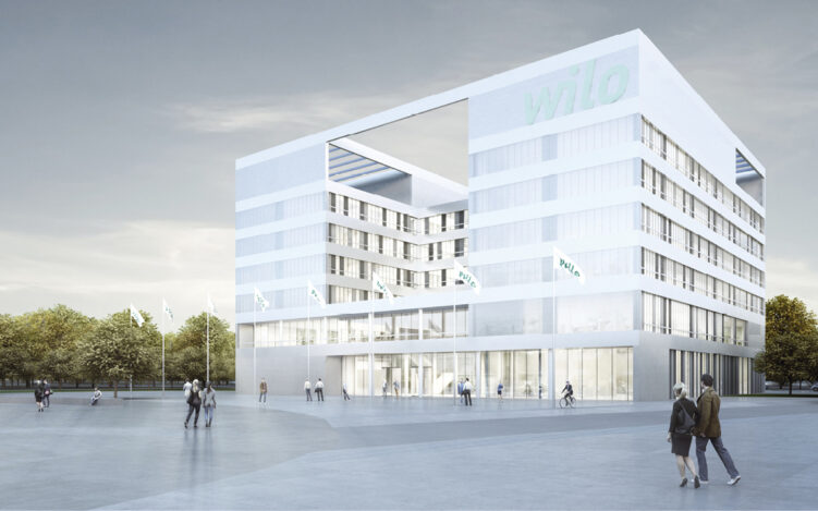 Die neue Verwaltung des Pumpenherstellers bündelt die wesentlichen Verwaltungsbereiche der Gruppenfunktionen. Bei der Errichtung des Office haben sich die Planer von der Idee der Nachhaltigkeit von Gebäuden und Grundstücksnutzung nach den Green Building-Standards der Deutschen Gesellschaft für Nachhaltiges Bauen e. V. Gold und „Leadership in Energy and Environmental Design“ Gold leiten lassen. Die transparente Hülle sorgt für maximale Ausnutzung des Tageslichts und natürliche Beleuchtung aller Arbeitsplätze. Zugleich erfüllt sie die Anforderungen an ein hocheffizientes, energie- und ressourcensparendes Gebäude. Das Office teilt sich in belebte und öffentliche Nutzungsbereiche im Sockel sowie ruhigere Arbeitsorte in den Flügeln und Obergeschossen auf. Das Erdgeschoss ist die Veranstaltungs- und Kommunikationszone und beherbergt neben Kantine und Cafés mit dem Foyer einen zentralen Treffpunkt. Über offene Treppen ist das 1. Obergeschoss mit seinen Meeting- und Konferenzbereichen zu erreichen, wo es weitere Angebote für formelle und informelle Kommunikation, Teamarbeit, Seminare und Veranstaltungen gibt. Auf den Etagen darüber sind auf jeweils zwei Flügeln die Büroflächen angeordnet, die im Sinne moderner Arbeitswelten gegliedert sind und Raum für unterschiedliche Arbeitsweisen bieten. Hier werden als Ausdruck des „Wilo Future Office“-Konzepts Räume für kommunikative Teamarbeit und sogenannte „Hot Desks“ – Arbeitsplätze, die sich mehrere Mitarbeiter teilen können und die nach dem täglichen Bedarf ausgesucht werden – im Zentrum und in den Konzentra­tionsbereichen in den Flügeln geschaffen.