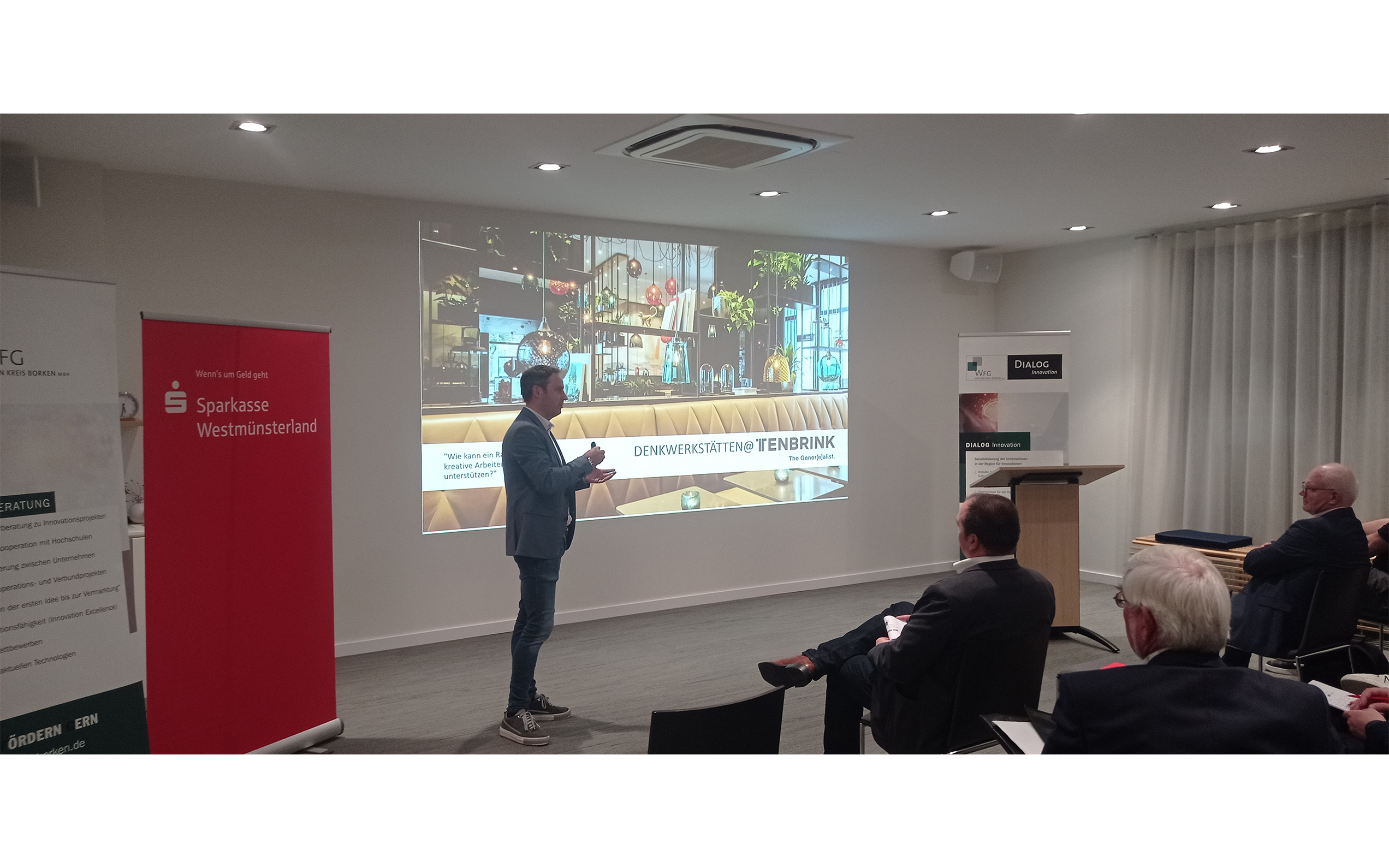 Wie Innovationskultur erfolgreich in Unternehmen umgesetzt wird, diskutierten die rund 30 Teilnehmer beim „Dialog Innovation“. Zu dieser Veranstaltung hatte die Wirtschaftsförderungsgesellschaft für den Kreis Borken mbH (WFG) am 10. November 2022 gemeinsam mit der Sparkasse Westmünsterland in die Veranstaltungsräume der Tenbrink Gruppe nach Stadtlohn eingeladen. „Welches Umfeld sollte geschaffen werden, um Ideen zu entwickeln und Innovationen umsetzen zu können? Wie lässt sich in diesem herausfordernden Umfeld die Zukunft in unseren mittelständischen Unternehmen erfolgreich gestalten? Was befördert ein erfolgreiches Innovieren? Mit diesen Fragen eröffnete Dieter Wenning, Direktor Firmenkunden der Sparkasse Westmünsterland, die Veranstaltung. Als Gastgeber der Veranstaltung gab Frank Wessels, Geschäftsführer von Tenbrink, Einblicke in die Gestaltung der neuen Kreativräume des Unternehmens. Diese wurden in Zusammenarbeit mit der Westfälischen Hochschule entwickelt. Flexible Möbel, beschreibbare Wände, einfache Materialien zur Ideenfindung und kreative Farbgestaltung gehören zur Ausstattung des Kreativraums. „Gern sind auch andere Firmen eingeladen, unsere Räume für kreative Prozesse im Unternehmen zu nutzen. Ein Tapetenwechsel und ein Verlassen der gewohnten Umgebung fördert die Kreativität und gibt Raum für neue Ideen“, so Wessels.