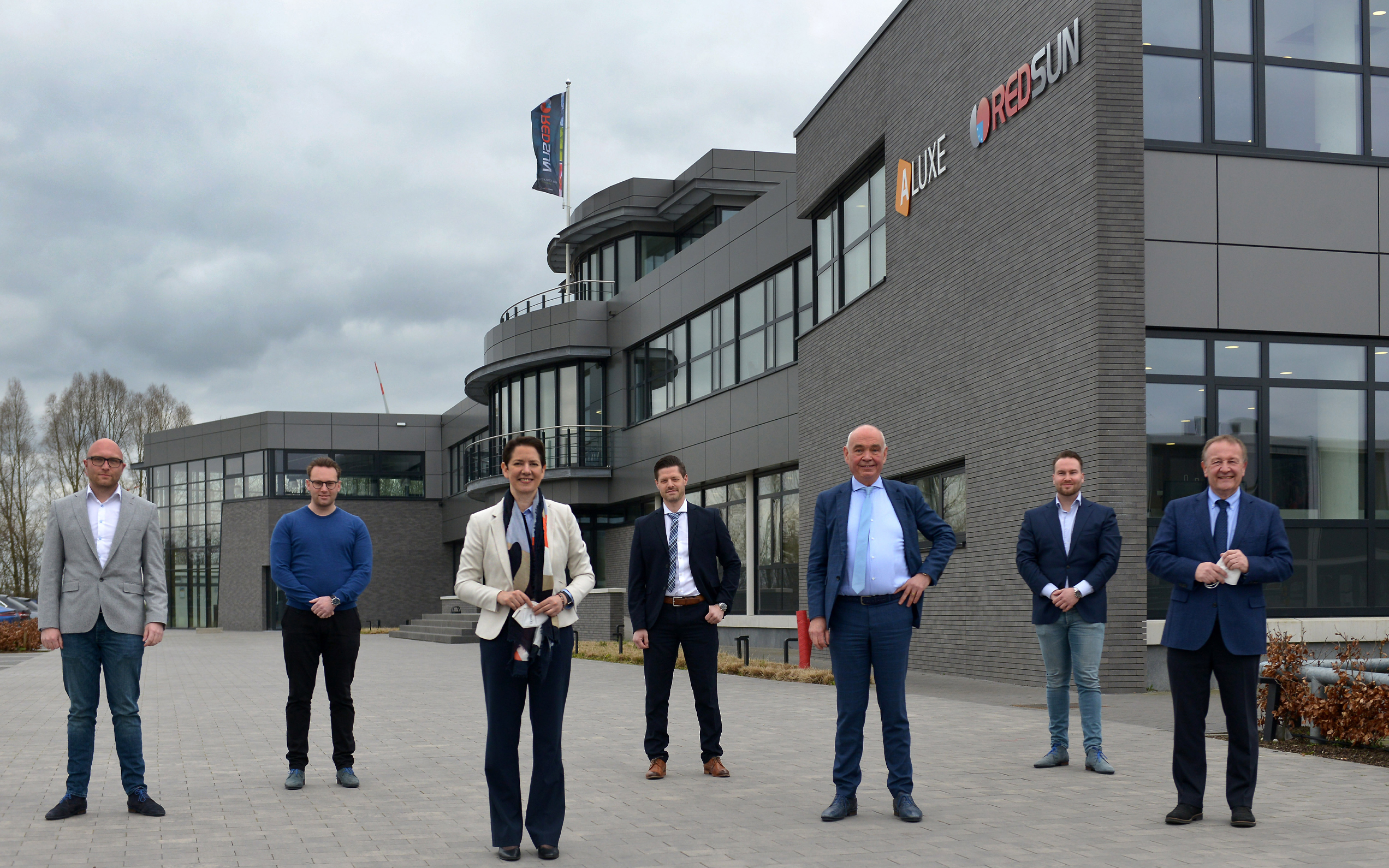 „Es war für mich in der Vergangenheit immer wieder beeindruckend, das Unternehmen Redsun über viele Jahre so schnell wachsen zu sehen. Umso größer ist für mich die Freude, heute erstmals als Landrätin für den Kreis Kleve hier zu Gast sein zu dürfen“, grüßte Silke Gorißen die Firmenleitung des 1985 von Ger van Ommeren in den Niederlanden gegründeten Familienunternehmens bei einem Besuch. Zusammen mit Hans-Josef Kuypers, Geschäftsführer der Wirtschaftsförderung Kreis Kleve, blickte die Landrätin auf die Firmengeschichte. Die heute rund 500 Mitarbeiter, darunter 300 in Kevelaer, produzieren knapp vier Millionen Quadratmeter Gestaltungspflaster pro Jahr. Auf dem Firmengelände mit einer Gesamtfläche von 38 Hektar stehen vier Betonwerke, Absack-Anlagen und moderne Lagergebäude. Seit jüngstem dominiert ein Verwaltungsgebäude mit den Schriftzügen „Redsun“ und „Aluxe“ das Betriebsgelände mit rund 20 werkseigenen Lastkraftwagen. Die Redsun Unternehmensgruppe ist ein Familienbetrieb und daher hat Direktor und Eigentümer der Redsum Unternehmensgruppe hat seinen drei Söhnen Arjan, Coen und Geert leitende Aufgaben übertragen. Mit Jan Steufkens hat ein Leitender Mitarbeiter Prokura erhalten, der vor Jahrzehnten als erster Auszubildender und später als Werkstudent beim noch jungen Unternehmen seinen Berufsweg startete. „Ich kenne Redsun von der Grundsteinlegung an – und seither wirbt man an der Bundesstraße um weitere Mitarbeiter“, erinnerte sich Hans-Josef Kuypers als Wirtschaftsförderer des Kreises an die letzten zwei Jahrzehnte. Auch derzeit sei man wieder auf der Suche nach einer weiteren Gewerbefläche, am liebsten unweit des vorhandenen Standortes. Hier soll der eigenständige Betrieb „Aluxe“ von seinen heute bereits über 100 Mitarbeitern auf 250 wachsen.