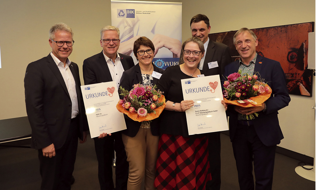 Zum ersten Mal hat die Industrie- und Handelskammer (IHK) Mittlerer Niederrhein Firmen für ein besonders innovatives Betriebliches Gesundheitsmanagement (BGM) im Kammerbezirk ausgezeichnet. Zur Preisverleihung kamen Ende März rund 100 Gäste in die IHK. Die Mönchengladbacher Betriebe Rechenzentrum Hartmann GmbH & Co. KG, die Sozial-Holding der Stadt Mönchengladbach GmbH und die New AG konnten sich Preise sichern. Mit dem „BGM-Preis Mittlerer Niederrhein“ würdigt die IHK Mitgliedsunternehmen, die sich mit kreativen Maßnahmen umfassend, systematisch und nachhaltig für ihr BGM einsetzen. Eine unabhängige Expertenjury hatte die Sieger in drei Kategorien – kleine, mittlere und große Unternehmen – ausgewählt. Dr. Ralf Wimmer, Geschäftsführer der Unternehmerschaft Niederrhein, gratulierte der Sozial-Holding zum ersten Preis und der New AG zu Rang 2. „Uns ist sehr positiv aufgefallen, dass die Sozial-Holding bereits vor 17 Jahren erkannt hat, unter welchem Druck das Pflegepersonal steht und entsprechende Schritte eingeleitet hat“, so Wimmer. „Im Vordergrund standen dabei neben der physischen und psychischen Gesundheit der Mitarbeiter vor allem das soziale Wohlbefinden und der gute Umgang miteinander.“ Ähnlich ist die New AG vorgegangen. „Das Unternehmen hat sich vorgenommen, alle Führungsebenen so auszubilden, dass sie Betriebliches Gesundheitsmanagement vorleben und ihre Mitarbeiter motivieren“, erklärte Wimmer. Für die Kommunikation der BGM-Angebote wurde sogar ein eigenes Marketing- und Kommunikationskonzept samt Logo erarbeitet. In der Kategorie „Kleine Unternehmen“ sicherte sich die Rechenzentrum Hartmann GmbH & Co. KG den zweiten Preis. „Es wurden Firmenfahrräder für kurze Dienstwege angeschafft, es wurden Duschen für Mitarbeiter eingerichtet, die zur Arbeit joggen oder mit dem Rad fahren, es gibt Wasserspender, höhenverstellbare Tische, alternative Sitzmöglichkeiten, eine Tischtennisplatte und einen Fitnessraum“, schilderte Susanne Thywissen, Vizepräsidentin der IHK Mittlerer Niederrhein. Um zu ermitteln, welche langfristigen Angebote das Unternehmen für seine Mitarbeiter entwickeln kann, hatte die Geschäftsführung des Unternehmens zudem eigens einen