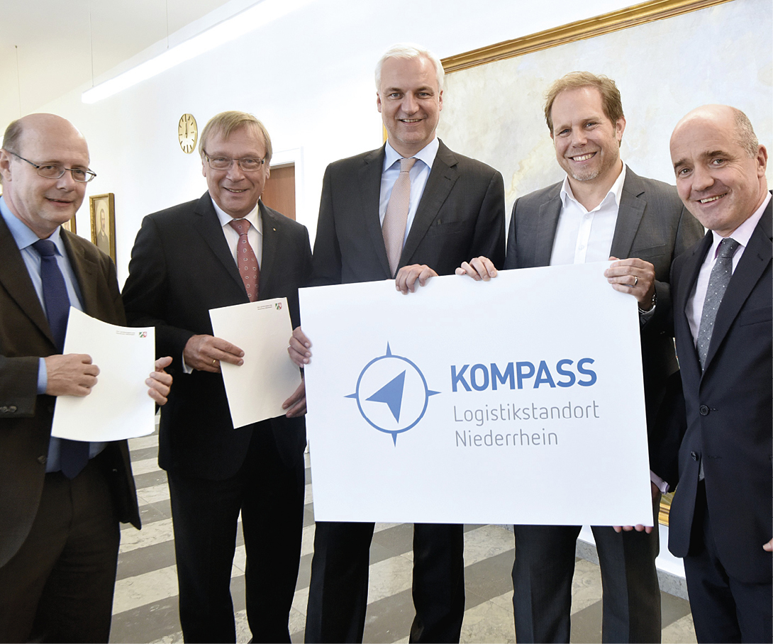 Logistische Prozesse laufen 24 Stunden am Tag, sieben Tage in der Woche. Auch wenn der Verkehr ruht, geht die Logistik weiter: Wo und wie können Ladungen und Container sicher verwahrt werden? Wo können sich Lkw-Fahrer während ihrer Ruhezeiten aufhalten? Welchen Beitrag kann eine intelligente Steuerung der Verkehre zur Optimierung leisten? Mit diesen Fragen beschäftigt sich das Projekt ‚Kompass Logistik Niederrhein‘, das die Niederrheinische IHK gemeinsam mit dem Zentrum für Logistik und Verkehr der Universität Duisburg-Essen in diesem Herbst startet. Das Projekt hat ein Fördervolumen von 170.000 Euro und wird mit Mitteln aus dem Europäischen Fonds für regionale Entwicklung und mit Landesmitteln gefördert. Den Startschuss gab NRW-Wirtschaftsminister Garrelt Duin am 22. September und übergab den Bewilligungsbescheid offiziell an Vertreter der IHK und Universität. „Der Niederrhein mit dem Duisburger Hafen ist einer der führenden Logistikstandorte in der Welt. Hier werden Warenströme nicht nur über den größten Binnenhafen Europas verteilt, sondern auch mit Lkw transportiert. Um die Entwicklungsfähigkeit des Wirtschaftsstandortes zu sichern, unterstützen Land und EU dieses innovative Projekt“, so Minister Duin. „Die Unternehmen haben ein großes Interesse, dass die Logistik am Niederrhein funktioniert, sie wollen ihren Beitrag leisten, um Belastungen für Bürger und Kommune so gering wie möglich zu halten. Gleichzeitig gilt es, neue Konzepte zu entwickeln, die den Logistikstandort attraktiv machen und neue technische Möglichkeiten zu nutzen, um Logistik sicherer, sauberer und effizienter zu machen“, betonte IHK-Präsident Burkhard Landers.