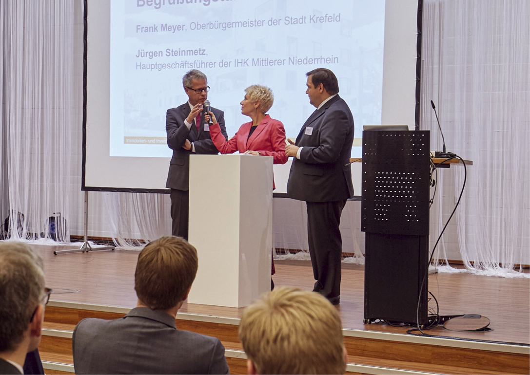 Gewerbe braucht Wohnraum“ – unter diesem Motto stand das Krefelder Immobilien- und Investorenforum 2016. „Unsere Stadt wächst, der Wohnraumbedarf nimmt zu“, sagte Oberbürgermeister Frank Meyer. „Wir müssen große Anstrengungen unternehmen und alle Möglichkeiten ausschöpfen, wenn wir diese Chance für Krefeld nutzen wollen.“ IHK-Hauptgeschäftsführer Jürgen Steinmetz erinnerte daran, dass die Lebensqualität einer Stadt und die Güte des Wohnraums längst ein entscheidender Standortfaktor seien. Im Impulsvortrag des Mönchengladbacher Bauunternehmer und Vorsitzende des Landesverbands NRW beim Bundesverband Freier Immobilien- und Wohnungsunternehmen e.V., Martin Dornieden, erläuterte dieser welchen Herausforderungen sich die Kommunen und die Bauwirtschaft stellen müssen: „Wir haben enorme Zuwächse in den Städten, vor allem junge Menschen zieht es in die Zentren.“ Davon könnten Städte mit Hochschulen – wie zum Beispiel Krefeld – enorm profitieren, so Dornieden. „Früher haben sich Unternehmen vornehmlich in der Nähe von Bodenschätzen oder Verkehrsachsen niedergelassen, heute gehen die Firmen dorthin, wo sie gut ausgebildete und kreative Mitarbeiter finden können.“