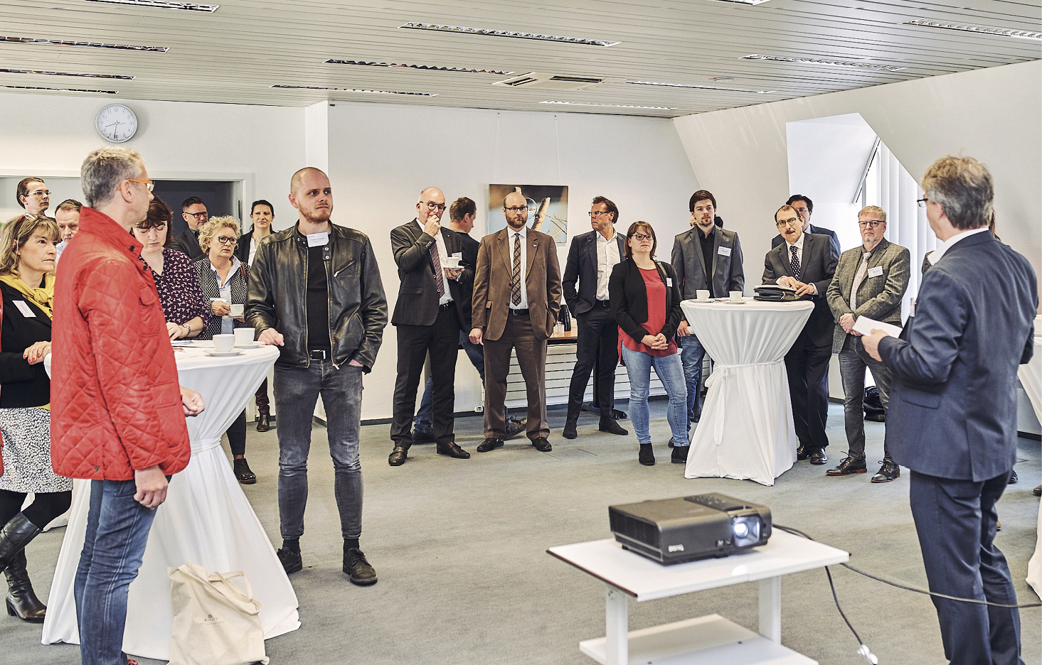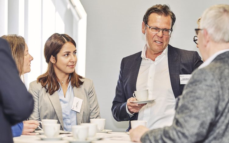 „Das rege Interesse hält an, seit über acht Jahren. Das zeigen uns die wiederkehrenden Gäste und der Besuch immer neuer Teilnehmer. Der Austausch zweier Geschäftskulturen motiviert zur Anreise selbst zur frühen Stunde“, erläutert Guido Schmidt von der Wirtschaftsförderung Brüggen das Erfolgsgeheimnis. So auch dieses Mal beim Treffen in Brüggen am 10. April 2019. Direkt nach dem Eintreffen versammeln sich erste deutsche und niederländische Gäste an den Stehtischen, tauschen Visitenkarten aus und kommen bei der ersten Tasse Kaffee ins Gespräch. Eine Teilnehmerliste, die vorab online für die gezielte Vorbereitung bereitsteht, schafft Transparenz und die Möglichkeit, über das morgendliche Treffen hinaus ins Gespräch zu kommen. Unterbrochen wird das Netzwerken der Teilnehmer nur kurz durch Jörg Raspe, IHK Mittlerer Niederrhein, und Guido Schmidt, Wirtschaftsförderung der Burggemeinde Brüggen, die die knapp 40 Unternehmer begrüßen. Es folgt eine kurze Vorstellung neuer Gäste, womit sich erste Anknüpfungspunkte für die weiteren Gespräche ergeben.