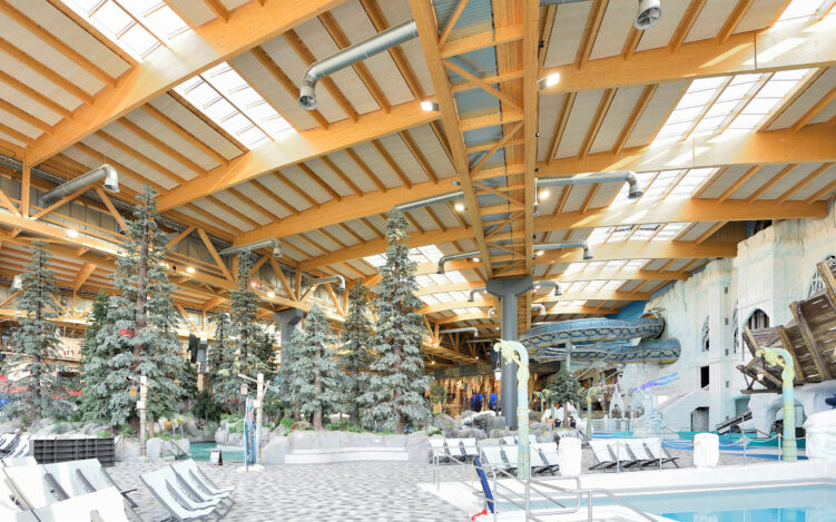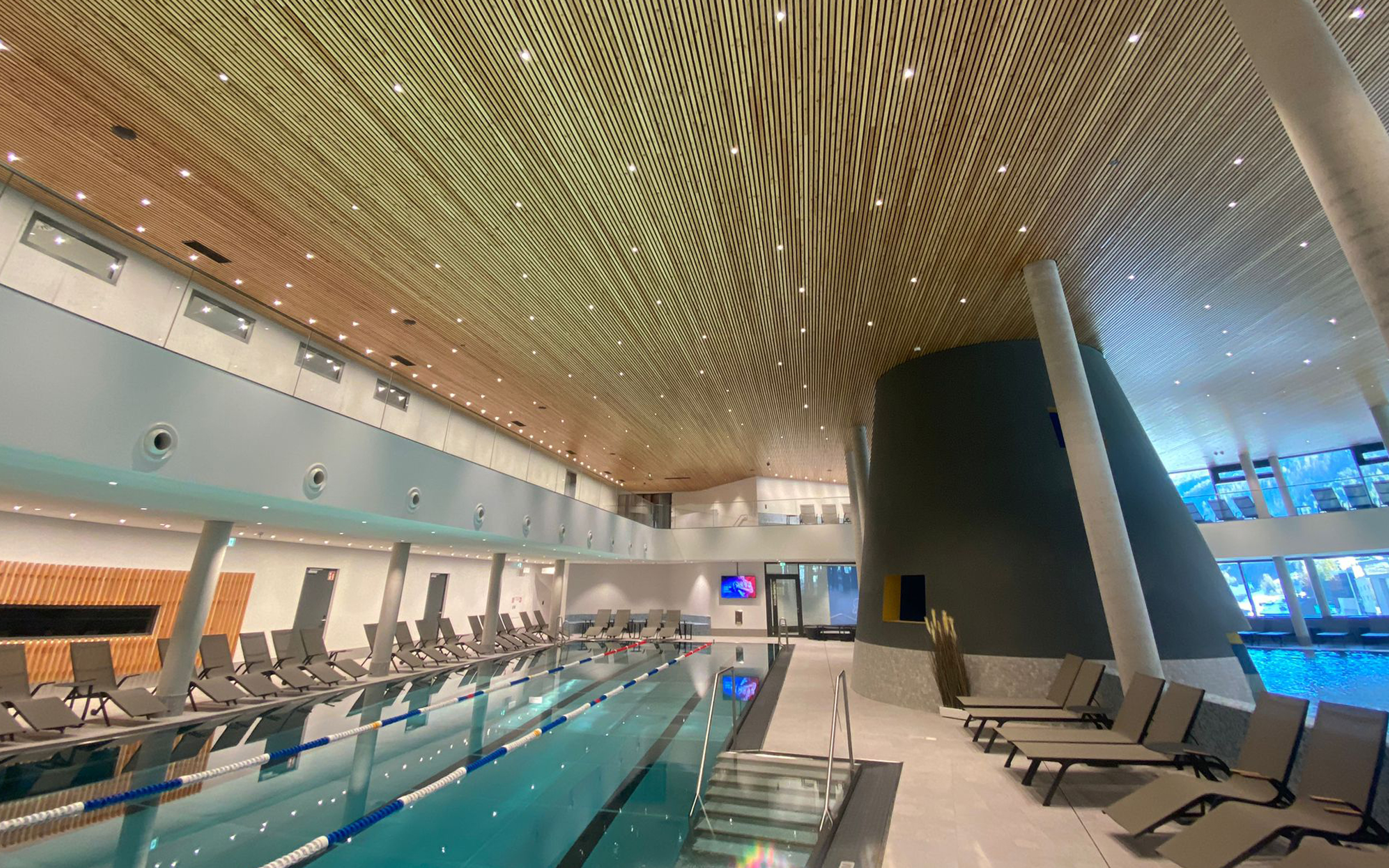 abliefert. „Unser zweites Schwimmbad war ein Goldschuss“, erinnert sich Tenner. „Da wurden Projektleiter und Architekten hellhörig. Das hat sich entwickelt, heute machen wir immer so sechs bis sieben Schwimmbäder gleichzeitig.“ Mit insgesamt 50 Monteuren und Mitarbeitern leitet Tenner ein Team von beträchtlicher Größe. Eines der größten Projekte war die Wasserwelt für den Europapark in Rust in Baden-Württemberg. Dort montierte die Akustik Gesthüsen GmbH rund 5.000 Quadratmeter Holzwolle-Akustikdecken, etwa 6.500 Quadratmeter Aquapaneele, Vorsatzschalen und Sonder-Wolkendecken. Auch an den Projekten „Center Parcs Leutkirch“ im Allgäu, sowie an der neuen Therme in Ischgl war die Firma