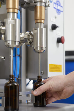 verpacken und abfüllen. So wurden in dem Unternehmen in den letzten Monaten unter anderem Grillsaucen, Gewürze, Nahrungsergänzungsmittel aber auch Reinigungsmittel abgefüllt. Ein weiteres Produktbeispiel ist ein Warzenstift, der wird bei Ludewig komplett montiert, befüllt und verpackt. Dabei werden die Produkte in großen Gebinden angeliefert. So zum Beispiel Hustensaft für Hunde und Katzen, der in großen Fässern ins Unternehmen kommt. Anlieferung und Versand geschehen innerhalb des Unternehmens auf sehr kurzen Wegen, was beim Neubau des Gebäudes gleich entsprechend geplant wurde. Für die Abfüllung von Flüssigkeiten bis hin zu zähflüssigen Pasten, wie zum Beispiel Grillsaucen, gibt es multifunktionale Maschinen, die sogar Pasten mit kleinen Stücken abfüllen können. Dazu müssen nur die Düsen ausgetauscht werden. Wichtig ist allerdings ein professionelles Reinigungs- und Desinfektionskonzept für die Maschinen. Die Maschinen werden abends gründlich gereinigt und morgens vor Beginn der Produktion desinfiziert. Die Mitarbeiter an den Maschinen reinigen ihre Hände grundsätzlich auf beide Arten.