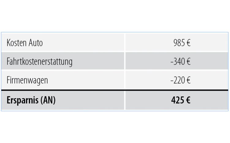 Anders sieht es aus Sicht der Arbeitnehmerin aus. Sie hat bei einem Bruttogehalt von 3.000 € für den Firmenwagen Abzüge in Höhe von etwa 220 € im Monat. Würde sie die Kosten des Autos in Höhe von 985 € selbst tragen und bekäme die Fahrtkosten von 340 € im Monat erstattet, ergäbe sich folgende Situation aus Sicht