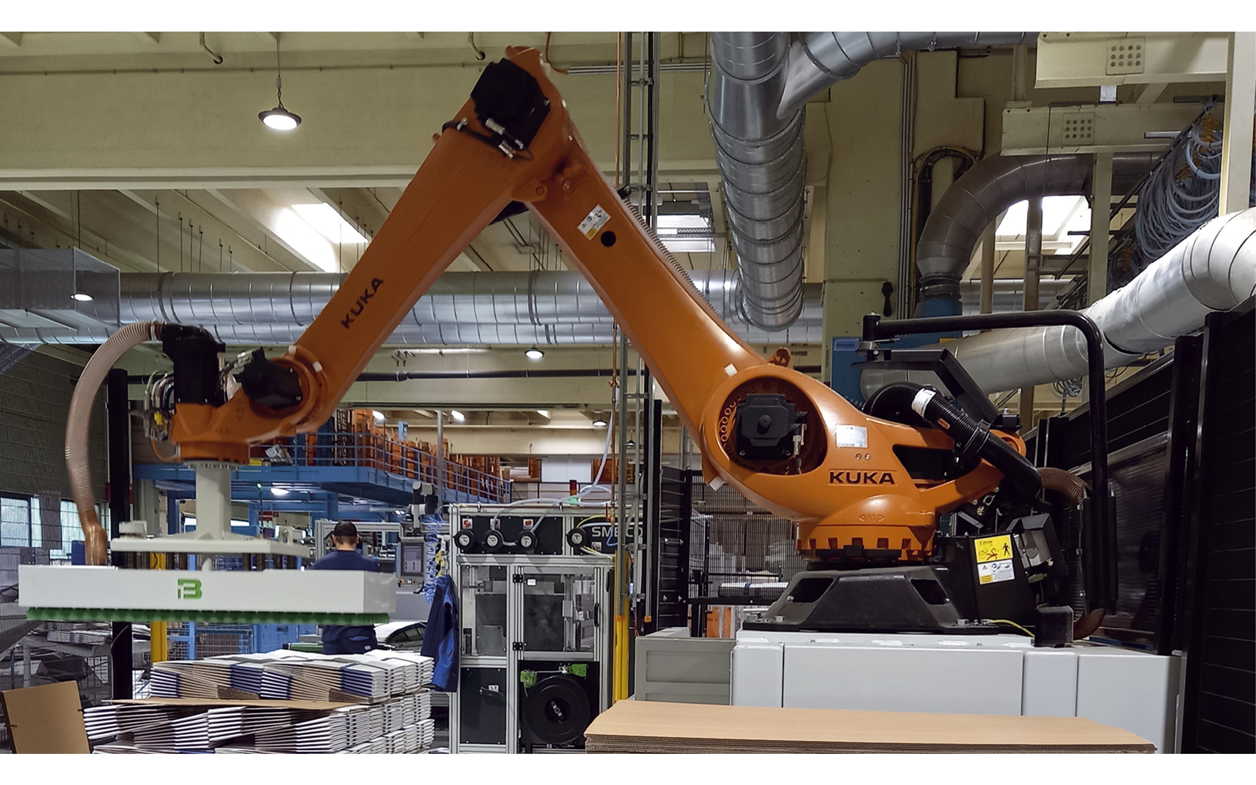 Diese Robot-Palettierungssysteme, die in die bestehenden Produktionsstraßen integriert wurden, dienen der Prozessautomatisierung und fassen automatisch Packstücke zusammen. Die mehrachsigen Industrieroboter mit Multigreifern sind in der Lage, alle Kartonagen auf Unterlegbögen abzulegen. Aufgrund der wenigen, aber hochwertigen Komponenten wie Display, Steuerung, Multigreifer, Zentrierer und Einlaufbahn ist eine bequeme Bedienung für die Mitarbeiter möglich. Intelligente und intuitive Software mit starker Visualisierung dient der Optimierung von Abläufen. Technische Fehler werden ebenso wie Bedienerfehler sofort erkannt und korrigiert. Neben der Gewährleistung von reibungslosen Produktionsabläufen und der Steigerung der Produktivität ist der gesundheitliche Aspekt mit entscheidend. Packvorgänge, die zuvor manuell von den Mitarbeitern ausgeführt werden mussten, konnten Rücken-, Nacken- und Schulterprobleme verursachen. Durch die neue Robottechnik kommt es zur Entlastung des gesamten Muskel-Skelettsystems und Schädigungen können vermieden werden.