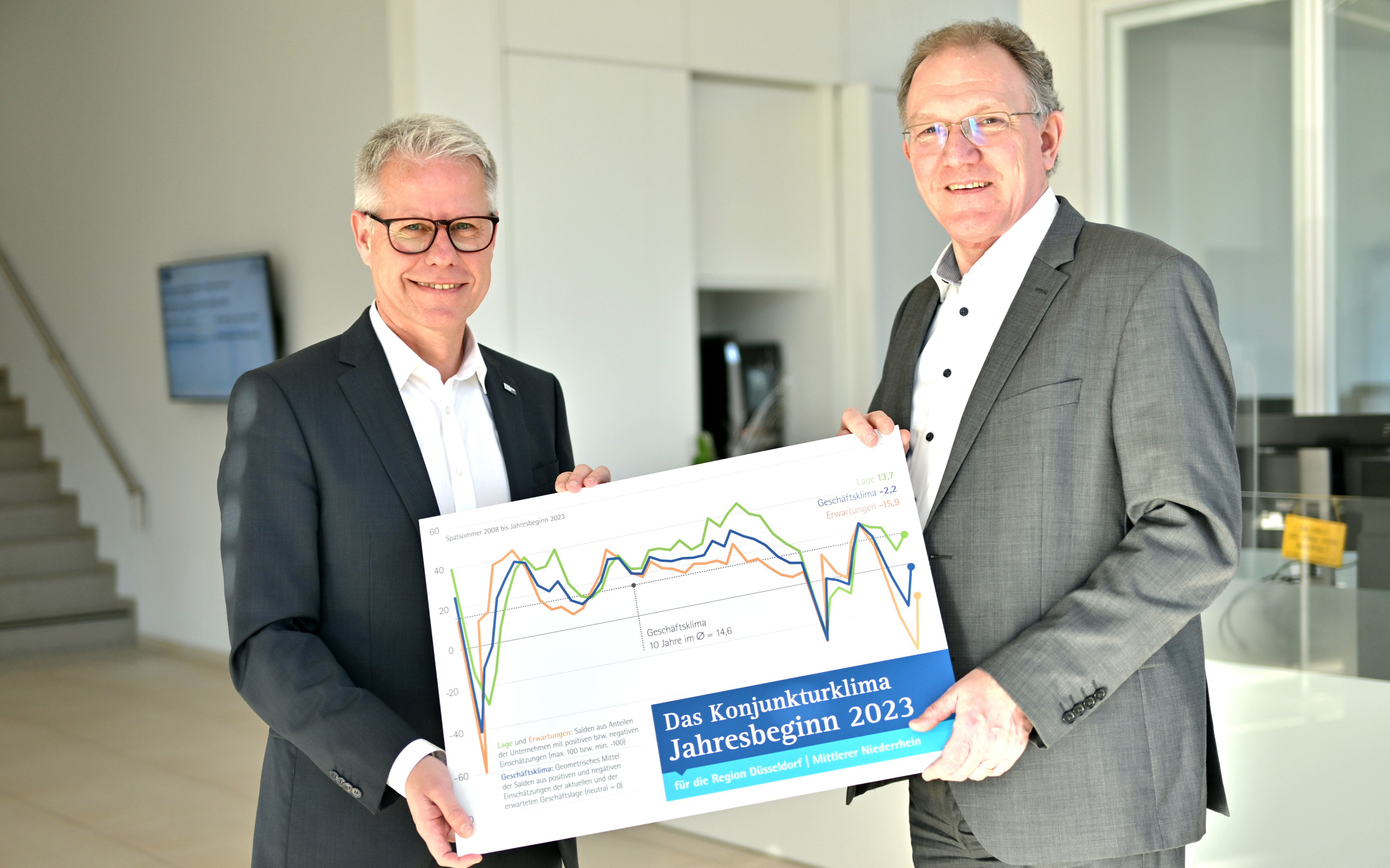 Die Geschäftslage der Betriebe in der Region Düsseldorf/Mittlerer Niederrhein hat sich zum Jahresbeginn leicht verbessert und bleibt damit auf einem stabilen Niveau. Der Geschäftslageindikator in der Region ist seit dem Herbst leicht von 7,2 auf 13,7 Punkten gestiegen. Im Rhein-Kreis Neuss ist er leicht von 0,0 auf -0,7 Punkte gesunken. „Die pessimistischen Erwartungen der Unternehmen aus dem Herbst des vergangenen Jahres sind bisher nicht eingetreten“, erklärte Jürgen Steinmetz, Hauptgeschäftsführer der Industrie- und Handelskammer (IHK) Mittlerer Niederrhein, bei der Vorstellung des Konjunkturberichts Anfang Februar. „Dennoch befürchten immer noch viele Unternehmerinnen und Unternehmer, dass sich ihre Geschäftslage wegen der großen Belastungen durch die Energiepreise, die weltwirtschaftlichen Herausforderungen und die ungebrochene Inflation im Jahr 2023 verschlechtert.“ Unter diesen Vorzeichen ist vorerst nicht mit Wachstum zu rechnen. Die Industrie- und Handelskammern Düsseldorf und Mittlerer Niederrhein hatten knapp 850 Unternehmen in der Region befragt. „Viele Faktoren entscheiden über die wirtschaftlichen Entwicklungen der nächsten Monate. Es überwiegen weiterhin die belastenden Faktoren, zudem sind die Risiken erheblich und deshalb bleibt die Unsicherheit groß“, fasst Gregor Berghausen, Hauptgeschäftsführer der IHK Düsseldorf, zusammen. In Summe rechnet die regionale Wirtschaft weiter mit einer Rezession – allerdings mit mildem Verlauf. Konkret rechnen 33,8 Prozent der Unternehmen im Rhein-Kreis Neuss mit einer Verschlechterung der Geschäftslage im laufenden Jahr, nur 15,9 Prozent hoffen auf eine kurzfristig bessere Entwicklung.