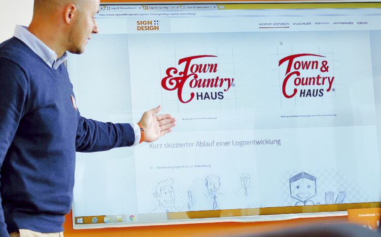 Was in der niederrheinischen Heimat kaum jemand weiß: Zu den Kunden der kreativen Köpfe zählen bundes- und zum Teil sogar weltweit bekannte Firmen. So findet sich auf der Referenzliste von SIGN+DESIGN® beispielsweise das Who’s who deutscher Bauunternehmen aus dem Wohn- und Eigenheimbereich. Dazu zählt u.a. der Massivhaus-Spezialist Town & Country, der sich seit der Gründung im Jahr 1997 zu einem der größten Franchisegeber in der deutschen Immobilienbranche entwickeln konnte. „Seit 1999 dürfen wir unseren Partner Town & Country als Hausagentur auf seinem erfolgreichen Weg begleiten und mit unseren Ideen unterstützen“, erzählt Uwe Bergh nicht ohne Stolz. „Viele werberelevante Produkte, die Sie von T&C in der Hand halten, haben ihre Wurzeln in unserem Haus.“