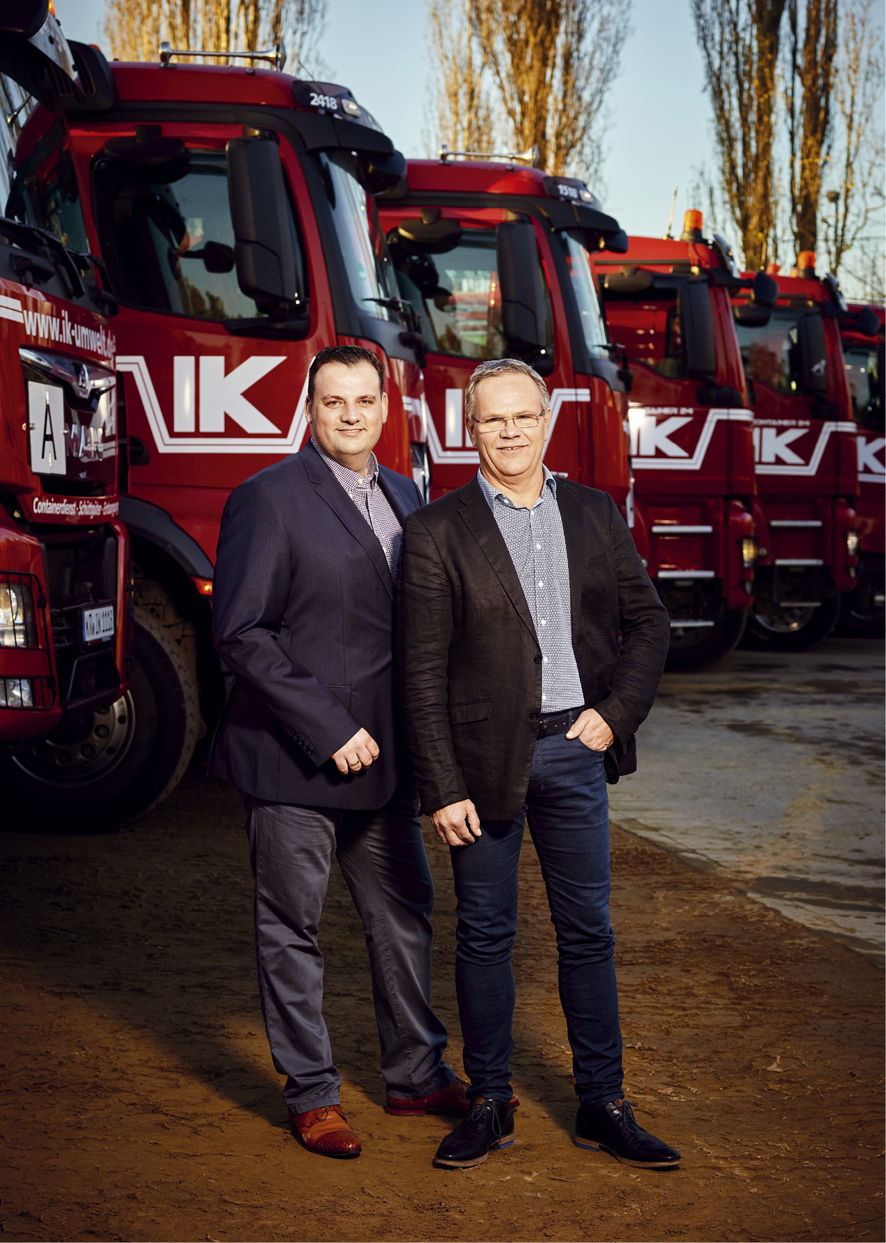 „Mit dem Lkw irgendwann zu einer Baustelle fahren, da den Abfall aufladen und ihn zur Entsorgung bringen – das können doch viele“, erklärt Mirco Illian, als die Sprache darauf kommt, warum seine IK Container- und Entsorgungsgesellschaft GmbH einer der größten und modernsten gewerblichen Abfallentsorger der Region ist. Für ihn und seinen Co-Geschäftsführer Andre Raser reicht das jedoch nicht aus. „Wir bieten unseren Kunden Pünktlichkeit, Flexibilität, Unabhängigkeit und den kompletten Service von der Beratung zur vorschriftsmäßigen Abfalltrennung bis hin zu den Nachweisen über die ordnungsgemäße Verwertung der verschiedenen Stoffe.“ Täglich steuern rund 60 Fahrzeuge des Entsorgers und Baustoffhändlers vom Sattelzug bis zum Containerwagen die zahlreichen Baustellen der Auftraggeber in der Region an und legen dabei in Summe bis zu 20.000 Kilometer zurück. Das Ziel sind überwiegend gewerbliche oder Industriebaustellen sowie Baumaßnahmen der Städte und Kommunen entlang der Rheinschiene. Einen Schwerpunkt bildet dabei der Straßen- und Tiefbau, den das Unternehmen auch mit Schüttgutbaustoffen jeglicher Art versorgt. Zu rund fünf Prozent gehören auch Privatleute zu den Auftraggebern.