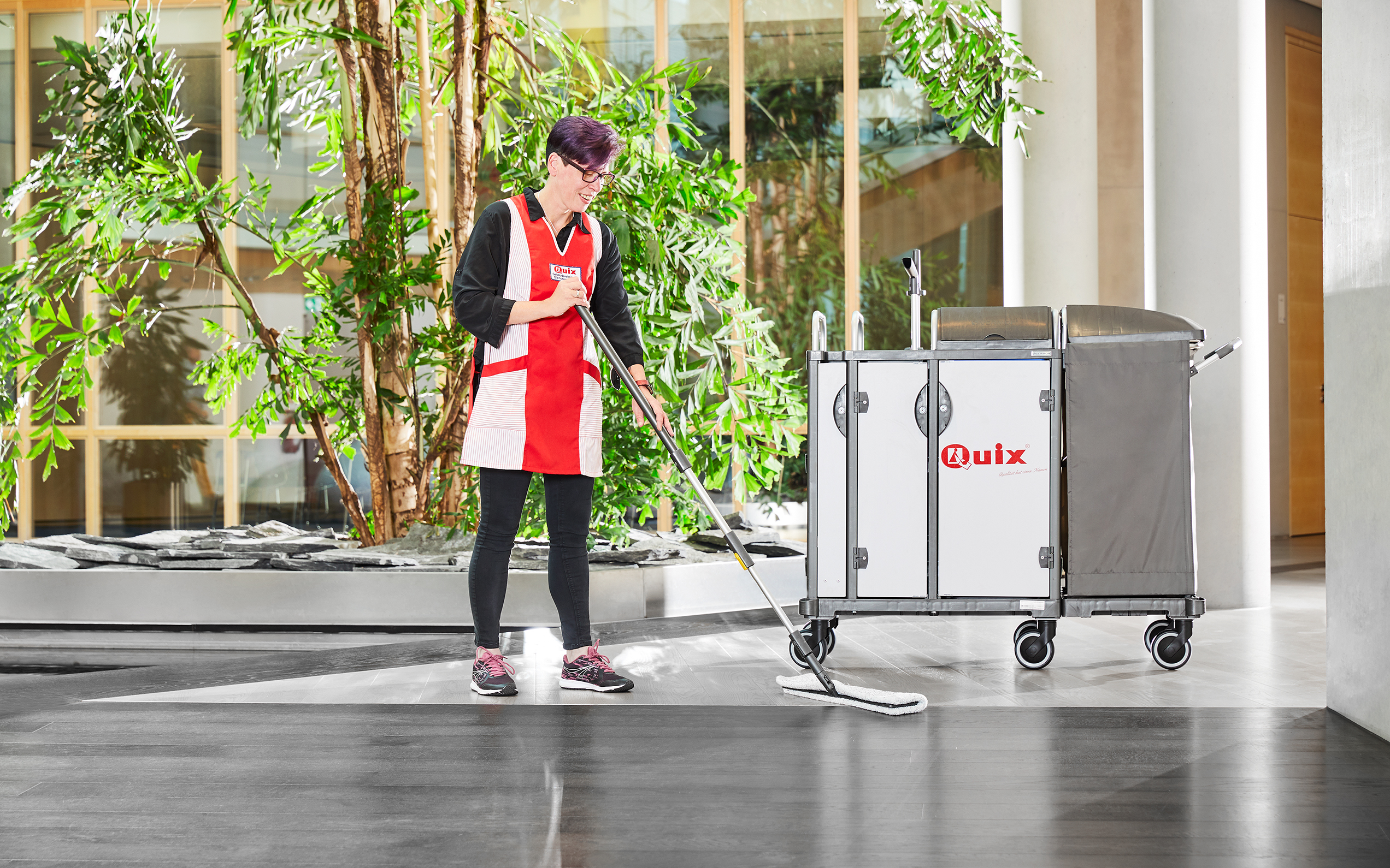 Dabei ist NOW© ökonomisch, ökologisch und sozial aufgebaut. Die Vorteile liegen beim Kunden im einzigartigen Verhältnis von Preis und Leistung in der EOR. „Unsere Quadratmeterleistungen liegen deutlich über dem Marktstandard und führen neben einem sauberen Haus zur Werterhaltung der Immobilie. Für uns als Unternehmen bedeuten zufriedene Kunden eine gute Reputation und mehr Profit. Wir würden nie über den Preis neue Aufträge akquirieren. Unsere Maxime ist und bleibt die Qualität.“ Seit vielen Jahren setzt Quix als ökologisch aufgestelltes Handwerksunternehmen auf nachhaltige Produkte und Techniken. Die Reduzierung von Wasser, Strom, Chemie sowie nachhaltige Produkte brachten entsprechende DIN ISO-Zertifizierungen sowie eine Ökoprofit-Auszeichnung ein. All dies geht mit dem hohen sozialen Engagement für die zum Teil langjährigen Mitarbeiterinnen und Mitarbeiter einher, die sich auf tarifliche und übertarifliche Leistungen und Rahmenbedingungen verlassen können. Zweimal jährlich werden alle Beschäftigten fachlich geschult: Sie nehmen an Sicherheitsunterweisungen mit eigenen Fachkräften teil und werden, je nach Bedarf, in speziellen Trainings auf ihre Aufgaben vorbereitet. Das bedeutet regelmäßige Investitionen in Gesundheitsmanagement, Ergonomie und Arbeitssicherheit. Regionale Vernetzung und Sponsoring runden das NOW©-Portfolio ab.