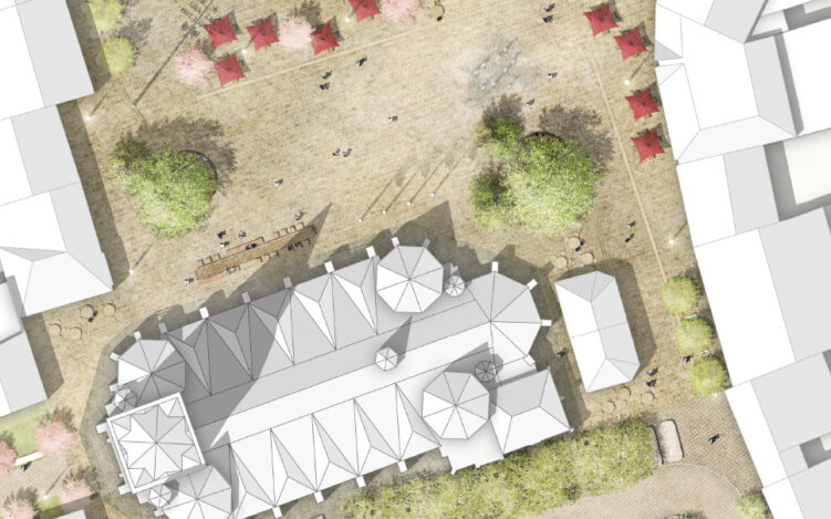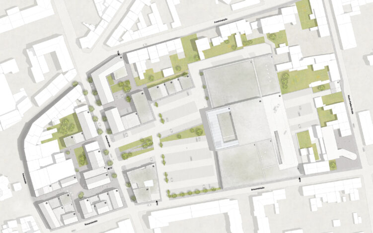 Der Siegerentwurf des Wettbewerbs führt diese zwei Welten nun zusammen: Einerseits gelingt es, die eher kleinteilige, altstädtische Blockstruktur zwischen Marktplatz und Grabenstraße mit der durch den Rewe-Markt geprägten Großstruktur zu verbinden. Im Norden, auf dem Gelände der ehemaligen Brauereipassage, die abgerissen werden soll, bildet der neu ausformulierte Blockrand eine Art Rahmen für den solitären Akzent auf der Süd-West-Ecke des Parkplatzes. Durch diese zusätzlichen Gebäude besteht nun auch die Möglichkeit, zeitgemäße Einzelhandelsflächen zu generieren, die größenmäßig in Willich fehlen. Auch für die aktuell ungenutzten Obergeschosse des Rewe-Marktes haben sich attraktive Lösungen angeboten, die zusammen mit einer architektonischen Aufwertung des Gebäudes künftig das neue, interessante Bild prägen werden.
