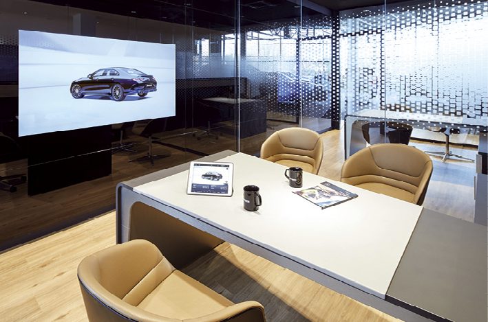 „Entstanden ist ein Autohaus mit einer klaren Designsprache, lichtdurchfluteten Räumen, ansprechenden Lounge-Bereichen und neuester Technik“, freut sich Verkaufsleiter Ulrich Kemper. Edle, dunkle Flächen dominieren den neuen Schauraum – unterbrochen von riesigen LED-Bildschirmen, die die Marke ab sofort auch virtuell erlebbar machen. „Der Einsatz von digitalen Großbildflächen und Tablets soll für eine spürbar verbesserte Betreuungsqualität in der Kundenberatung sorgen“, so Ulrich Kemper. Schließlich kann hiermit die komplette Bandbreite der Marke mit ihren 34 Modellreihen, komplexen Ausstattungsvarianten und technischen Features nahezu lebensecht abgebildet werden.