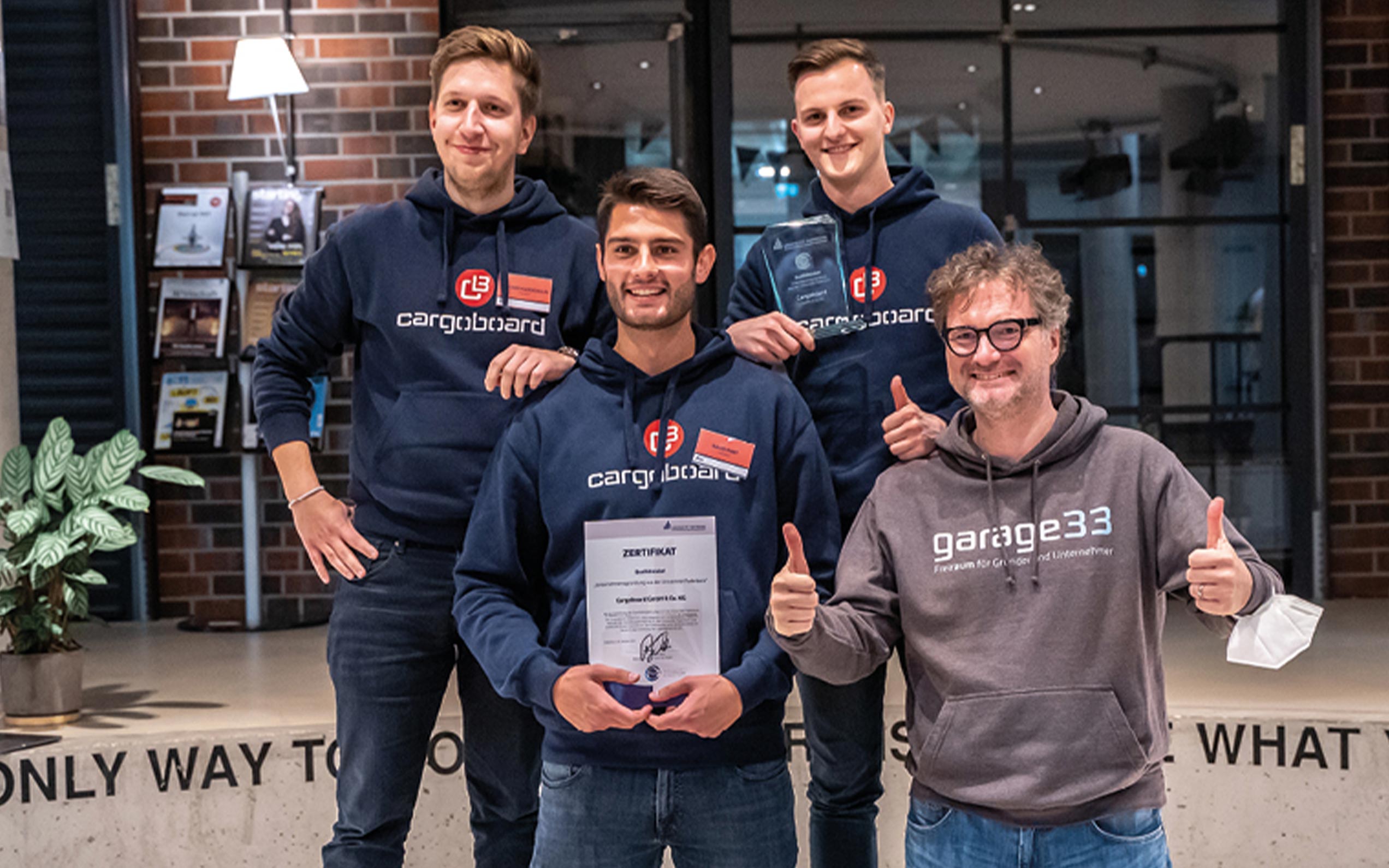 Ein Start-up-Team erhielt darüber hinaus eine ganz besondere Auszeichnung: Professor Dr. Rüdiger Kabst überreichte das Qualitätslabel „Unternehmensgründung aus der Universität Paderborn“ an die Cargoboard GmbH & Co. KG. Damit zeigt sich die Universität für das Engagement im Rahmen der Gründungsförderung sowie für das innovative Geschäftsmodell im Bereich Digitalisierung der Logistikbranche mit Vorbildfunktion gegenüber der Cargoboard GmbH & Co. KG erkenntlich. Lukas Petrasch, Richard Kleeschulte und David Port, Mitgründer des Unternehmens, nahmen den Preis stellvertretend für das Team entgegen. Artur Nachtigal, der Vierte des Gründungsteams, verfolgte die Veranstaltung digital. „Ich freue mich sehr über die Auszeichnung – ein weiterer Meilenstein für uns. 2018 gab es genau hier, in der Arena der garage33, einen Corporate-Workshop mit der CargoLine. Die Fragestellung war, wie man den Speditions- und Logistikmarkt innovativ verändern kann. Wir haben unsere Idee vor der CargoLine erfolgreich gepitcht, ein eigenes Büro in der garage33 bekommen, erste Prototypentests gemacht, den ersten Umsatz generiert und schließlich 2019 ausgegründet. Cargoboard hat die B2B-Stückgutspedition digitalisiert. Seitdem sind wir rasant gewachsen. Mittlerweile besteht unser Team aus 32 Mitarbeitenden. Wir möchten etwas von dem, was wir hier an Unterstützung erhalten haben, wieder zurückgeben“, erklärt Richard Kleeschulte.