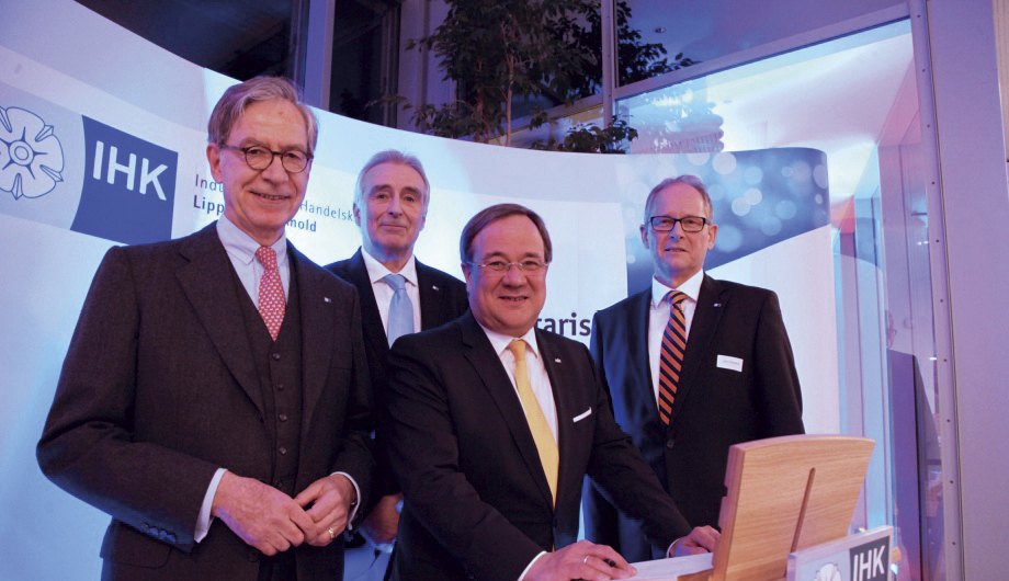 Zum diesjährigen Parlamentarischen Abend der IHK Lippe zu Detmold konnten IHK-Ehrenpräsident Ernst-Michael Hasse und der frisch gewählte IHL-Präsident Volker Steinbach einen hohen Gast begrüßen: NRW-Ministerpräsident Armin Laschet. Der Ministerpräsident betonte, dass ein ausgeglichener Haushalt keine Entschuldigung für versäumte Investitionen sein dürfe. Deshalb sei es für ihn wichtig, besonders in Ostwestfalen-Lippe, im Münsterland und in Südwestfalen präsent zu sein. „NRW hört nicht hinter Dortmund auf“, erklärte Laschet unter dem begeisterten Applaus des Publikums. Das zeige sich daran, dass die eigentliche industrielle Leistungskraft des Bundeslandes aus diesen westfälischen Regionen komme. Tatsächlich: NRW-weit sind 23,5 Prozent der sozialversicherungspflichtig Beschäftigten in der Industrie beschäftigt und in Lippe mehr als 30 Prozent. „Die Einstellung der Ostwestfalen und Lipper: ‚Wir wollen gar kein Geld von Euch, lasst uns einfach in Ruhe‘ ist mir sehr sympathisch“, erklärte Laschet. Genau auf diese Einstellung antworte das unter seiner Regie in Auftrag gegebene Entfesselungsgesetz. „Das bedeutet keine neoliberale Kälte der Deregulierung“, so Laschet. Vielmehr ermögliche das Gesetz, der Wirtschaft und den Hochschulen Spielräume zu schaffen. „Wir glauben, dass die Bürgermeister und Wissenschaftler vor Ort besser entscheiden können, was wichtig ist, als wir in Düsseldorf“, erklärte der 56-jährige Politiker. Sein Ziel sei es, den wirtschaftlich starken Regionen mehr Autonomie zu Teil werden zu lassen. Dazu müsse auch das Landesentwicklungsplangesetz verändert werden. Dass die Wirtschaft sehr weit oben auf seiner Agenda steht, verdeutlichte Laschet in seinem halbstündigen Vortrag auch an einer anderen Stelle. „Wir wollen mit dem Schulfach ‚Wirtschaft‘ dazu beitragen, dass Schüler eine Grundkenntnis über wirtschaftliche Zusammenhänge haben“, erklärte der Ministerpräsident. Denn „Politik ist nicht nur das Ausgeben von Geld“, betonte Laschet, der für seinen Vortrag immer wieder und auch am Schluss lang anhaltenden Beifall erhielt.