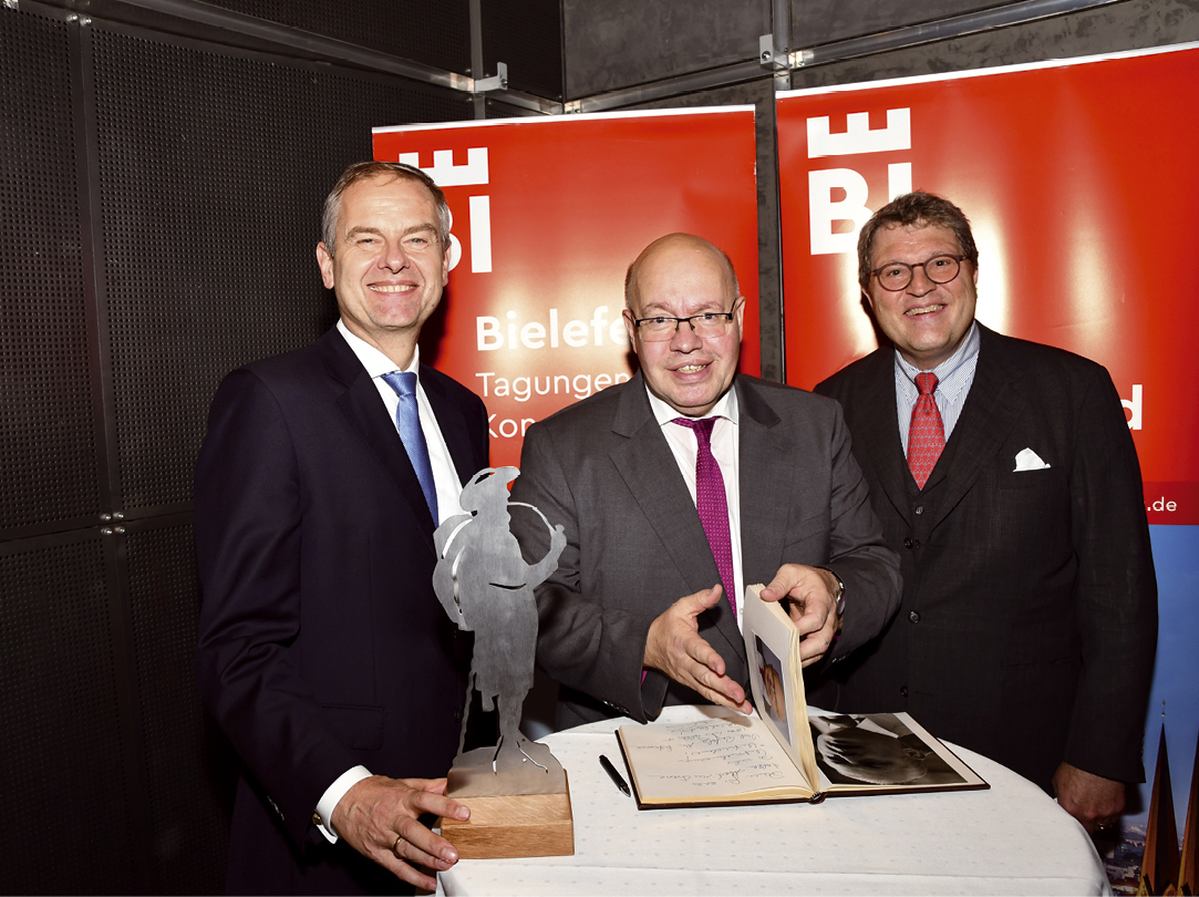 Das Label „Made in Germany“ sei angekratzt, hatte IHK-Präsident Wolf D. Meier-Scheuven in seiner Begrüßungsrede auf dem Unternehmertag OWL in Bielefeld beklagt. Auf die Verfehlungen der Automobilindustrie, den Pannenflughafen BER und die Bilder aus Chemnitz „mit einem hässlichen braunen Farbstich“ verwies er weiterhin. Wohl indirekt auch an Bundeswirtschaftsminister Peter Altmaier, einer der geladenen Redner, adressiert, mahnte Meier-Scheuven die Regierung, wieder mehr zu regieren, ohne dass man sie daran erinnern müsse. „Wir brauchen keinen Brexit, keine Handelskriege und keine politischen Kräfte, die auf Spaltung und Fremdenhass setzen“, betonte der IHK-Präsident und erntete dafür heftigen Applaus. Vor gut 1.500 angemeldeten Gästen lobte dann Peter Altmaier zunächst die Region Ostwestfalen-Lippe. Sie gehöre zu den Gegenden mit dem besten Ruf in Deutschland, hier sei das „Land, wo Milch und Honig fließt“ und „wo alles größer ist … Die Menschen sind größer, Parkplätze sind größer und auch die Sparkassen.“ Um nachhaltiges Wachstum zu sichern und die deutsche Wirtschaft zu stärken, kündigte Altmaier an, die Sozialversicherungsabgaben auf unter 40 Prozent festzuschreiben – und das unabhängig davon, wer gerade an der Regierung sei. Zeitnah wolle er mit Wirtschaftsvertretern darüber beraten, wie man die Strompreise angesichts der Energiewende stabil halten könne. Verlaufe die Umstellung zu einer digitalen Verwaltung weiterhin so schleppend, wolle er Experten aus Estland zurate ziehen, die Deutschland in dieser Hinsicht weit voraus seien. Altmaier werde einen Entwurf für ein Fachkräfteeinwanderungsgesetz vorbereiten und denke außerdem darüber nach, die Industrie beim Strukturwandel zu fördern, damit sie künstliche Intelligenzen sinnvoll einsetzen könne.