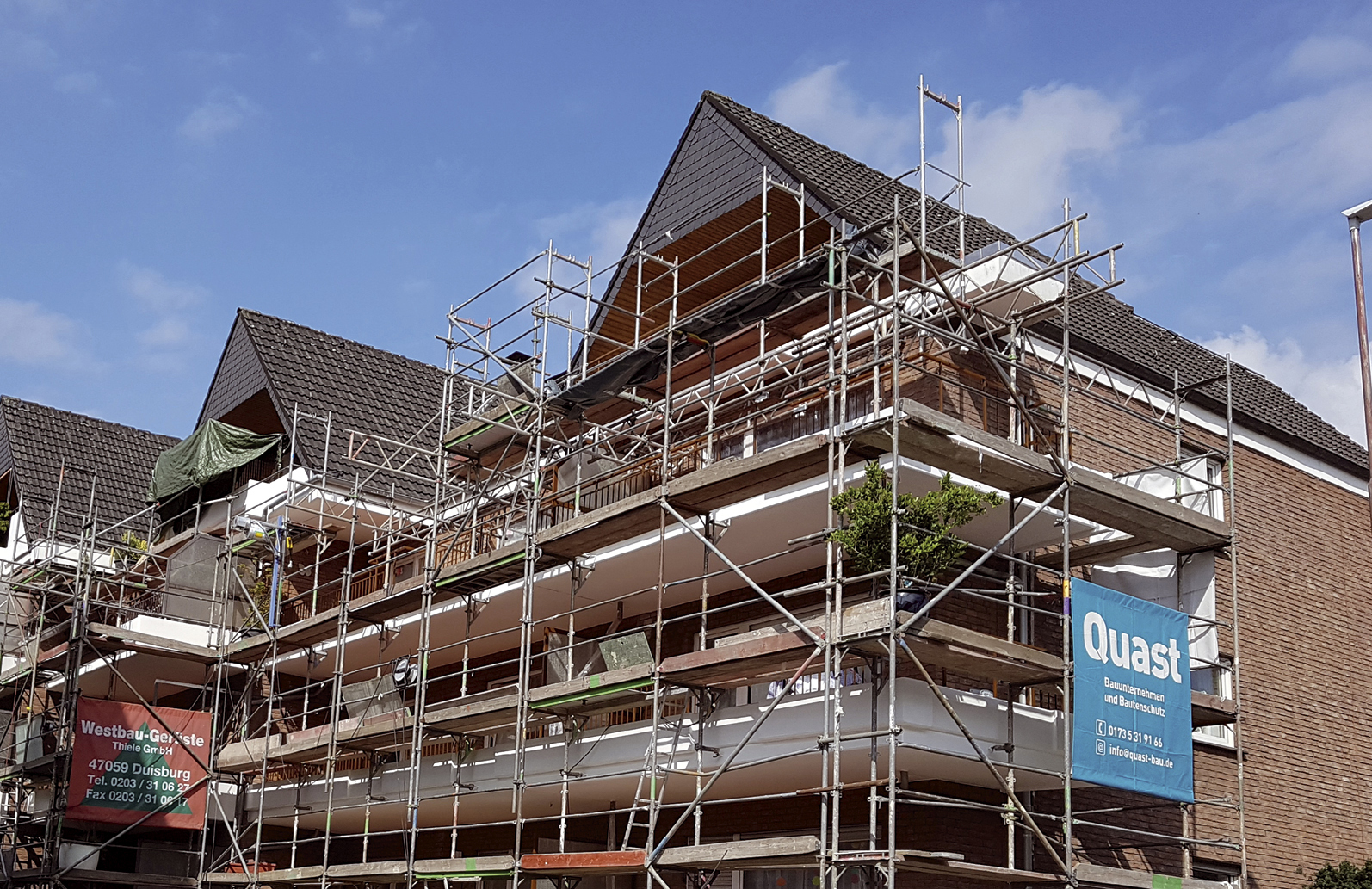 Bedingt durch die Witterungseinflüsse, werden besonders die Balkone eines Hauses stark in Mitleidenschaft gezogen. Vom Gerüstbauer über den Geländerbauer, Betonsanierer, Estrichleger oder Beschichter bis hin zum Maler sind hier schnell bis zu sieben verschiedene Handwerker im Einsatz, um sie wieder sicher und optisch attraktiv zu machen. „Bei uns erhält der Kunde aber alle Gewerke aus einer Hand und muss sich nicht um die sonst sehr aufwendige Koordinierung der verschiedenen Arbeiten kümmern“, schildert Sven Quast eines der Hauptaufgabengebiete seines Unternehmens. „So kann viel Zeit und unter dem Strich auch eine Menge Geld gespart werden.“ Betoninstandsetzung und fachgerechte Beschichtungen mit Flüssigkunststoffen sind dabei die Spezialgebiete von Quast-Bau, „mithin Arbeitsbereiche, von denen viele unserer Wettbewerber die Finger lassen, denn sie scheuen sich vor der komplizierten Ausführung und möglichen Gewährleistungsansprüchen, wenn die Arbeiten nicht ordnungsgemäß erledigt wurden.“ Wärmebrücken, von außen eindringende Feuchtigkeit oder falsche Durchlüftung von Kellern und Büroräumen ist in vielen Firmen der Grund für Schimmelbildung an den Wänden: „Durch eine falsche Wandfarbe kann das Problem schnell verstärkt werden“, beschreibt Sven Quast eine weitere Kernaufgabe seines Sanierungsteams. Die Folge können gravierende gesundheitliche Probleme sein: „Wir müssen die Räume im Extremfall komplett abschotten, alle Gegenstände gründlich säubern und dann so sanieren, dass keine Schimmelrückstände zurückbleiben.“