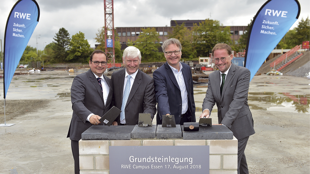 Mit einer feierlichen Grundsteinlegung hat RWE Mitte August den Start der Bauarbeiten für ihre neue Unternehmenszentrale eingeleitet. Die in Essen an der Altenessener Straße entstehenden Bürogebäude bilden mit dem bestehenden Gebäude der RWE Supply & Trading und der modernisierten früheren Verwaltung der Zeche Victoria Mathias den künftigen „RWE-Campus“. Den symbolischen ersten Stein setzte Rolf Martin Schmitz, Vorstandsvorsitzender der RWE AG, zusammen mit Essens Oberbürgermeister Thomas Kufen, Rolf Müller, Vorstand der Lang & Cie. Rhein-Ruhr Real Estate AG, und Jan-Hendrik Goldbeck, Geschäftsführer des Bauunternehmens Goldbeck GmbH. Für Rolf Martin Schmitz schließt sich mit dem Neubau ein Kreis: „Essen ist unsere Heimat. Und das schon seit 120 Jahren. Jetzt schlagen wir ein neues Kapitel auf.“ Zum einen mit dem Campus. Zum anderen mit der „neuen“ RWE, bei der künftig erneuerbare und konventionelle Erzeugung für eine Energiewende mit Versorgungssicherheit stehen. Im Frühjahr 2020 soll der erste Bauabschnitt der neuen RWE-Unternehmenszentrale an der Altenessener Straße fertiggestellt werden. Vor dem Hintergrund der Transaktion von RWE und E.ON hat Rolf Martin Schmitz die folgerichtige Erweiterung des Campus-Geländes um einen zweiten Bauabschnitt angekündigt, der bis Mitte 2021 fertiggestellt werden soll. Das Unternehmen ist zuversichtlich, dass die Projektpartner zu guten Lösungen kommen werden. Ziel sei es, für 600 bis 800 Mitarbeiter der Erneuerbaren Energien, die von Innogy und E.ON zu RWE wechseln werden, Platz auf dem Campus zu schaffen. Damit werden dort annähernd 3.000 Mitarbeiter tätig sein. „In einem kreativen und kommunikativen Arbeitsumfeld, in dem sich alle wohl fühlen können“, so Rolf Martin Schmitz.
