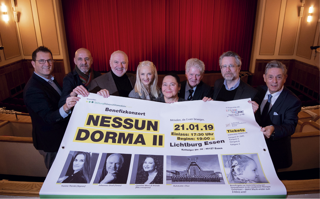 Unter dem Motto „Melodien, die Essen bewegen“ lädt die Stiftung Universitätsmedizin mit der „Lieblingsfarbe Bunt“ nach dem erfolgreichen Auftakt Anfang 2018 nun zum zweiten Mal zum klassischen Benefizkonzert ein: „Nessun Dorma II“ findet am 21.01.2019 um 19 Uhr in der Essener Lichtburg statt. Das Publikum darf sich auf Tenor Johannes Groß, Sopranistin Yvonne Prentki, Mezzosopranistin Caroline Merz und den traditionsreichen Ruhrkohle-Chor freuen, die eine breitgefächerte Mischung bekannter Stücke präsentieren. Begleitet werden die Künstler wie schon 2018 durch das Folkwang Kammerorchester Essen, dirigiert von Johannes Klumpp. Der Chefdirigent ist überzeugt: „Bei der vielfältigen Auswahl beliebter Meisterwerke ist für jeden Geschmack etwas dabei.“ Bei allem musikalischen Genuss geht es bei „Nessun Dorma II“ nicht nur um die Kunst, sondern auch darum, Unterstützung für Schwerstkranke zu ermöglichen. Alle Einnahmen aus dem Ticket-Verkauf sollen der Unterstützung von Innovationen in der HNO-Medizin zugutekommen, wie zum Beispiel Innovationen in der modernen Therapie Gehörloser. Prof. Dr. Karl-Heinz Jöckel, Vorstandsvorsitzender der Stiftung Universitätsmedizin, dankte den zahlreichen Partner und Helfern, insbesondere Heike Werner von Niessen. Prof. Dr. Jochen A. Werner, Ärztlicher Direktor und Vorstandsvorsitzender der Universitätsmedizin Essen, erklärte: „Durch den Erlös kann es gehörlosen Kindern, Jugendlichen und Erwachsenen erleichtert werden, mit Hilfe modernster Unterstützungsmaßnahmen in die Welt des Hörens geleitet zu werden.“ Mit einem klassischen Konzert für den guten Zweck einstehen – diesem Ziel schließen sich zahlreiche Unterstützer an. Kooperationspartner ist die Initiative „Lieblingsfarbe Bunt“, die sich für gemeinsames Einstehen für Toleranz, Respekt und Hilfe stark macht.