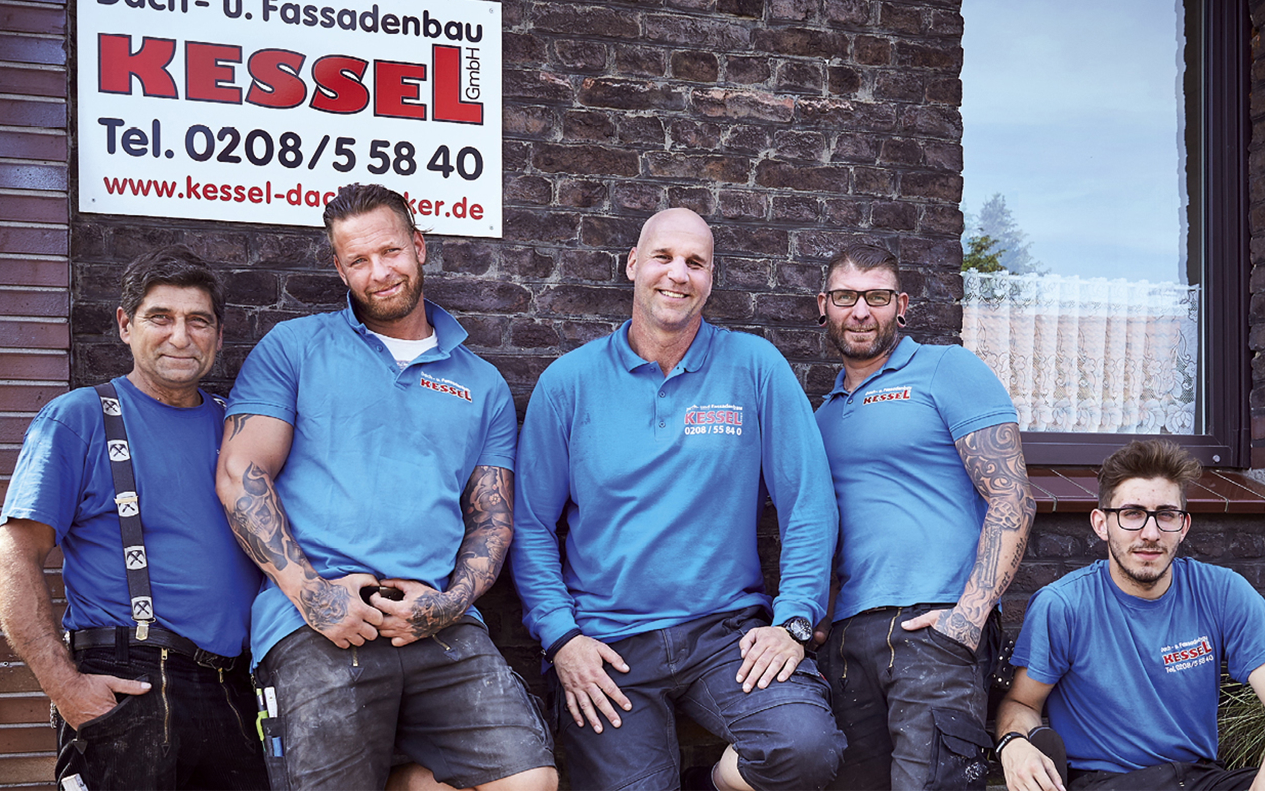 Die Kessel GmbH hat sechs Mitarbeiter: einen Meister, drei Gesellen, einen Lehrling und eine Hilfskraft im Büro. „Mit diesem kleinen, schlagkräftigen Team machen wir vor allem kleine und große Dacharbeiten, aber auch Fassaden und Servicearbeiten“, erklärt Kessel.