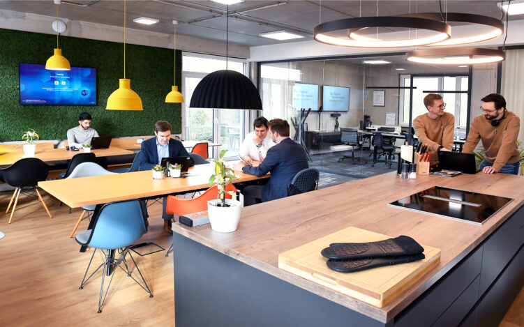 Als Tobias Rademann sein Unternehmen im Januar 2001 als Spin-off der Ruhr-Universität in Bochum gründete, platzte nur kurze Zeit später die Dotcomblase. Eine heilsame Erfahrung, die dem damaligen Jungunternehmer genau zur richtigen Zeit deutlich machte, dass nur ein gut fundiertes Wachstum zu nachhaltigem Erfolg führt. Gelernt hat er im Verlauf der Jahre auch, dass für eine IT-Unternehmensberatung keine Präsenz in einer Top-Citylage notwendig ist. Vor zwei, noch ganz frischen Monaten ist die R.iT-Zentrale nun wieder zurück in die Nähe der Bochumer Uni gezogen und hat in enger Kooperation mit VITRA eine 500-Quadratmeter-Büroetage nach dem innovativen Club-Office-Konzept der Schweizer Büroeinrichter gestaltet. Das Ziel: Die zentralen Anforderungen der digitalen Transformation – hohe Flexibilität und schnellen, abteilungsübergreifenden Austausch zu neuen Themen – auch in der Arbeitsumgebung möglichst optimal umzusetzen: „Unser Office ist jetzt in drei Zonen eingeteilt“, erläutert Luisa Pillath, die Verantwortliche für Backoffice und Personal. „Zunächst die Public Zone in offener Gestaltung für Meetings, Kundentermine, Aktivitäten wie gemeinsame Koch-Events oder den lockeren Talk in der Bar-Lounge. Im Semi-Public-Bereich finden Workshops oder Besprechungen statt, die durch flexible Vorhangsysteme abgeschirmt werden können.“ Und schließlich ist die Private Zone der konzentrierten Arbeit vorbehalten, wobei sich die Teammitglieder in einer modern gestalteten Fläche ihren höhenverstellbaren Arbeitsplatz individuell aussuchen können. „Das führt dazu, dass wir keine abgeschlossenen Abteilungen haben, sondern sich die verschiedenen Teams immer wieder neu mischen und dadurch sehr kreative Projektergebnisse erreicht werden“, beschreibt Luisa Pillath das funktionale und ebenso visuell ansprechende Ambiente. Dabei hofft sie sehr, dass die aktuelle Teamstärke von 30 R.iT-ler*innen möglichst schnell weiter wachsen wird, „allerdings stehen auch wir vor der Herausforderung, dass der Arbeitsmarkt in unserer Branche den wachsenden Anforderungen derzeit leider nicht gerecht wird.“