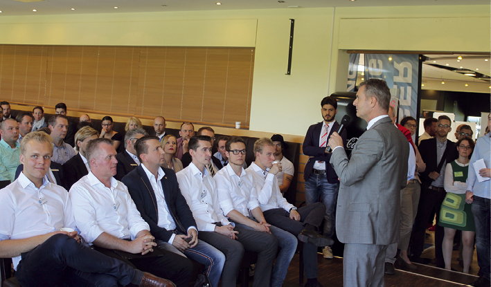 Gastredner für diverse Vorträge eingeladen: Autor und Redner Dirk Kreuter präsentierte seine Gedanken zum Thema „Wenn du es nicht verkaufen kannst, ist es nichts wert!“, kurz darauf stellte Joachim Hepp die Smartphone-App „Snapchat“ für Unternehmen vor und gab den Zuhörern neue Denkanstöße für ihren Auftritt im Netz. Abgerundet wurde die Vortragsreihe durch Beiträge von Burkhardt Jordan, der über die „12 Todsünden bei der Unternehmensgründung“ referierte, sowie Oliver Weimann zum Thema „Der perfekte Pitch“. Zum ersten Mal fand im Rahmen der Veranstaltung zudem das VfLFOUNDER-CAMP mit knapp 20 Jungunternehmern statt, die ihre innovativen Geschäftsideen und -modelle dem VfL und seinem Partnernetzwerk vorstellten. Drei dieser Unternehmen qualifizierten sich für eine Pitchrunde, eine renommierte Jury kürte schließlich die Ränge eins bis drei, die allesamt mit attraktiven Preisen ausgerufen waren. Zum wiederholten Mal konnten sich alle Interessenten zudem am Business Speed Dating beteiligen, um neue Kontakte zu knüpfen und Ideen und Anregungen auszutauschen oder zu finden. Um aus dem VfLNETZWERK-ERLEBNIS eine rundum gelungene Veranstaltung zu machen, durften die Besucher im Rahmen einer Stadionführung einen exklusiven Blick hinter die verschiedenen Kulissen des Vereins werfen und den VfL damit noch näher kennenlernen. Zum Abschluss fand nach dem offiziellen Teil des Tages noch die After Messe Party in gemütlicher Lounge-Atmosphäre statt, bei der alle Aussteller und Besucher die guten Gespräche des Tages fortführen und intensivieren konnten.
