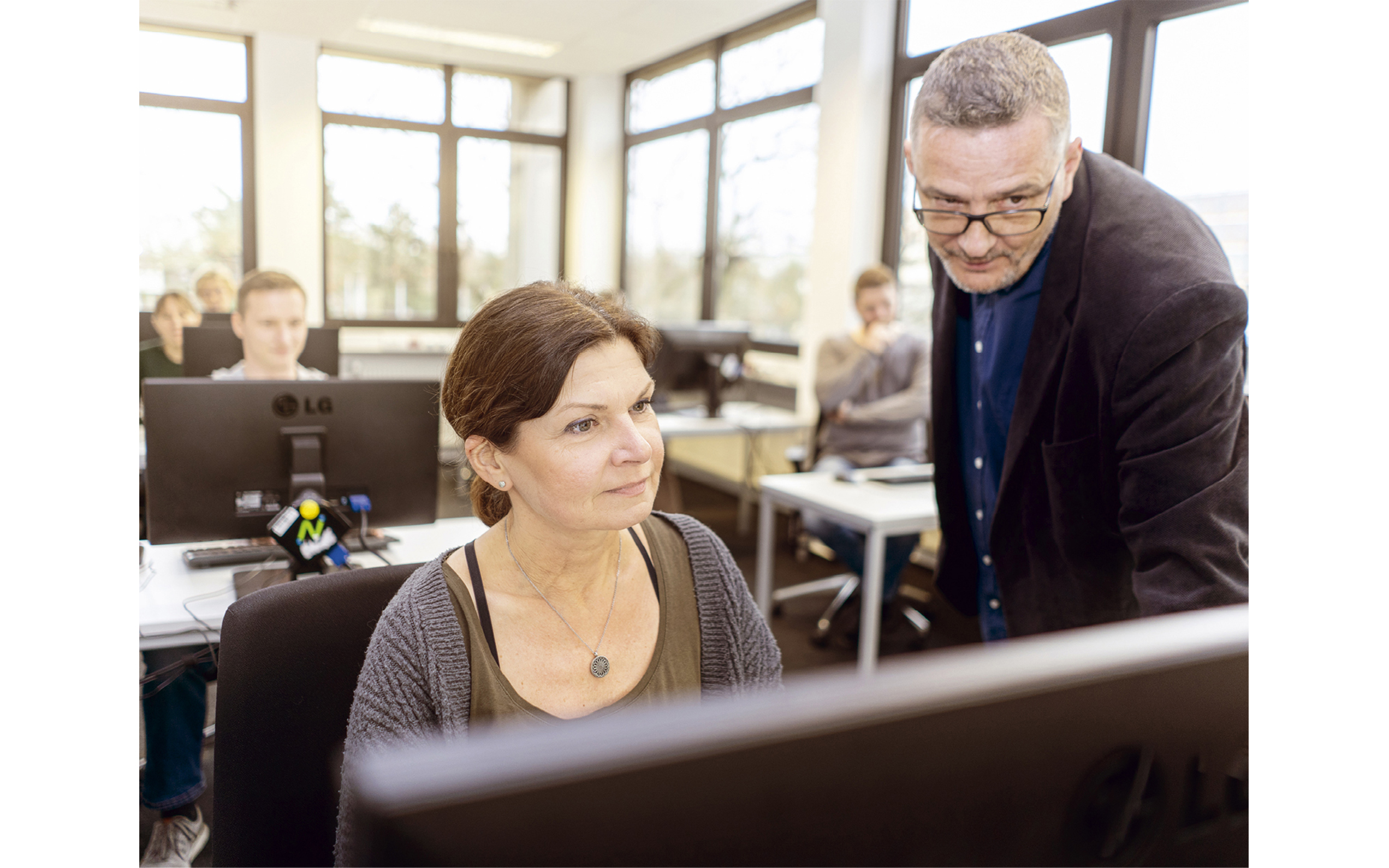 Im BTZ werden auch Teilnehmer, die aufgrund der Erkrankung erwerbslos geworden sind, Schritt für Schritt an die Herausforderungen des Arbeitsalltags herangeführt. Ob in den Bereichen IT, Verwaltung, Technik oder Handwerk – Betriebsnähe ist das Erfolgskonzept. „Wir sind keine Schule. Unsere Teilnehmer arbeiten unter Realbedingungen. Wir haben Modellbetriebe aufgebaut, die teilweise externe Aufträge bearbeiten“, erklärt der kaufmännische Leiter Frank Osterfeld. Das sei ein Grund dafür, warum viele Teilnehmer schnell wieder Fuß im Arbeitsleben fassen. Spätestens nach drei Monaten beginnen Praktika in Unternehmen vor Ort. Arbeitgeber und Teilnehmer werden dabei von Psychologen, Ergotherapeuten, Sozialpädagogen und anderen Professionen unterstützt. Im Praktikum würden viele Vorbehalte überwunden. „Es kommt nicht selten vor, dass ein Arbeitgeber eine unbefristete Stelle für den Praktikanten schafft – eben weil sie so leistungsfähig sind.“