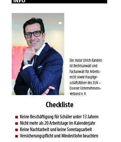 Die Sommerferien stehen vor der Tür – Zeit für Ferienjobs. Kurz vor Ende des Schuljahres werden Unternehmen verstärkt von Schülern kontaktiert. Der Aushilfsjob in den Ferien ist nicht nur für Schüler und Studenten attraktiv, die ihren Kontostand aufbessern wollen. Auch für Unternehmen lohnt es sich, Ferienjobs anzubieten – nicht nur, um Engpässe in der Urlaubszeit abzufedern: Wer einen fähigen Ferienjobber für sein Unternehmen begeistert, hat später womöglich einen guten Azubi oder Absolventen an der Hand. Dabei sollten die Firmen jedoch ein paar Dinge beachten. Die klassischen Ferienjobs sind für Jugendliche ab 15 Jahren erlaubt – aber nur mit Zustimmung der Eltern. Kinder unter 13 Jahren dürfen gar nicht arbeiten, bis 15 Jahren nur maximal zwei Stunden pro Tag. Für minderjährige Schulpflichtige gilt bei Ferienjobs eine Höchstarbeitszeit von 20 Tagen im Jahr. Unternehmen dürfen Jugendliche unter 18 Jahren nicht ans Fließband stellen oder Akkord arbeiten lassen und nicht für besonders belastende oder gefahrgeneigte Arbeiten einsetzen. Ferienjobber unter 18 Jahren dürfen in der Regel allerdings nur in der Zeit von 6 bis 20 Uhr beschäftigt werden. Ausnahmen gibt es für die Gastronomie (bis 22 Uhr), mehrschichtige Betriebe (bis 23 Uhr) und für Bäckereien und die Landwirtschaft (schon ab 5 Uhr), wenn der Ferienjobber mindestens 16 Jahre alt ist. Zwischen zwei Schichten bzw. Arbeitseinsätzen von höchstens acht Stunden muss eine Ruhezeit von mindestens zwölf Stunden liegen. Pausen müssen bei einer täglichen Arbeitszeit von 4,5 bis sechs Stunden mindestens 30 Minuten, bei einer täglichen Arbeitszeit von über sechs Stunden 60 Minuten betragen. Ferienjobber können befristet angestellt werden – für einige Wochen oder sogar Monate. Die Befristung sollte aus einem Sachgrund erfolgen, z.B. zur Urlaubsvertretung oder bei vorübergehenden Arbeitsspitzen. Wichtig ist zudem die entsprechende Dokumentierung des Sachgrundes – also für wen bzw. warum, wann und in welcher Funktion die Aushilfskraft eingesetzt wird. Mit einem konkreten Sachgrund kann dieselbe Aushilfskraft dann auch mehrere Sommer nacheinander befristet beschäftigt werden. Bei Vorliegen der entsprechenden Voraussetzungen können die Schüler als kurzfristig Beschäftigte oder geringfügig Beschäftigte eingestellt und dementsprechend abgerechnet werden. Im Übrigen richten sich Sozialversicherungspflicht und Steuern nach den allgemeinen Vorschriften. Seit 2017 müssen Unternehmer ihren Ferienjobbern mindestens 8,84 Euro pro Stunde Mindestlohn zahlen, wenn die Mitarbeiter 18 Jahre oder älter sind oder schon eine abgeschlossene Berufsausbildung haben. Der Mindestlohn gilt auch für Schülerinnen und Schüler, die sich in den Ferien etwas dazuverdienen wollen und schon volljährig sind. Werden Ferienaushilfen als Minijobber angestellt, dann verdienen sie 450 Euro pro Monat. Durch den Mindestlohn ergibt sich daraus umgerechnet eine maximale Arbeitszeit von 50,9 Stunden pro Monat. In einigen Branchen gelten noch Ausnahmeregelungen für den Mindestlohn. Für eine Übergangsfrist kann durch Tarifverträge mit Branchen-Mindestlöhnen, die bereits vor Einführung des Mindestlohngesetzes unter dem gesetzlichen Mindestlohn lagen, vom gesetzlichen Mindestlohn abgewichen werden. 2017 ist das noch für folgende Branchen relevant: bei Wäschereidienstleistungen im Objektkundenbereich, in der Land- und Forstwirtschaft sowie im Gartenbau. Gelten Branchen-Mindestlöhne, müssen Unternehmen der Branche auch ihren Aushilfen diesen Branchen-Mindestlohn zahlen, auch wenn er höher als der gesetzliche Mindestlohn ist. Zusammen mit dem Mindestlohn wurden im Mindestlohngesetz Dokumentationspflichten eingeführt. Bei allen Minijobbern muss seitdem aufgeschrieben werden, wann sie arbeiten und wie viele Stunden. Diese Aufzeichnungen müssen Unternehmen zwei Jahre aufbewahren.