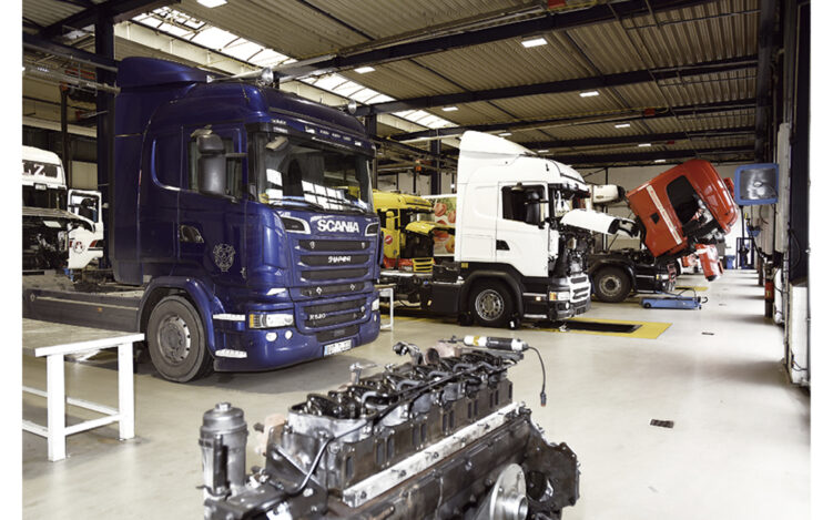 Sollte doch einmal etwas schiefgehen oder werden Routine-Wartungen fällig, bietet die Werkstatt am Breuer-Stammsitz in Duisburg-Beeck einen schnellen und professionellen Service. „Vor allem freitags und samstags arbeitet unsere Werkstatt auf Hochtouren“, so der Duisburger Unternehmer. „Gearbeitet wird in den zwei Werkstatthallen vor allem mit modernen Hebeanlagen, die eine über sieben Tonnen schwere Zugmaschine problemlos anheben können. Und auch die benötigten Ersatzteile – vom Filter bis zur kompletten Achse – sind stets zu fast 100 Prozent vor Ort verfügbar. Auf diese Weise wartet und repariert das 41-köpfige Werkstattteam täglich etwa 35 bis 40 Fahrzeuge. Darüber hinaus verfügt die Firma Breuer über mehrere, gut ausgestattete Werkstattfahrzeuge. Das Abschleppen liegen gebliebener Scania-Fahrzeuge besorgt ein Kooperationspartner. Ein besonderes Schmankerl für die Fahrer der reparierten Lkw sind die bequemen Übernachtungsmöglichkeiten auf dem Breuer-Gelände und die kleine VW-UP-Flotte für schnelle Heimfahrten.