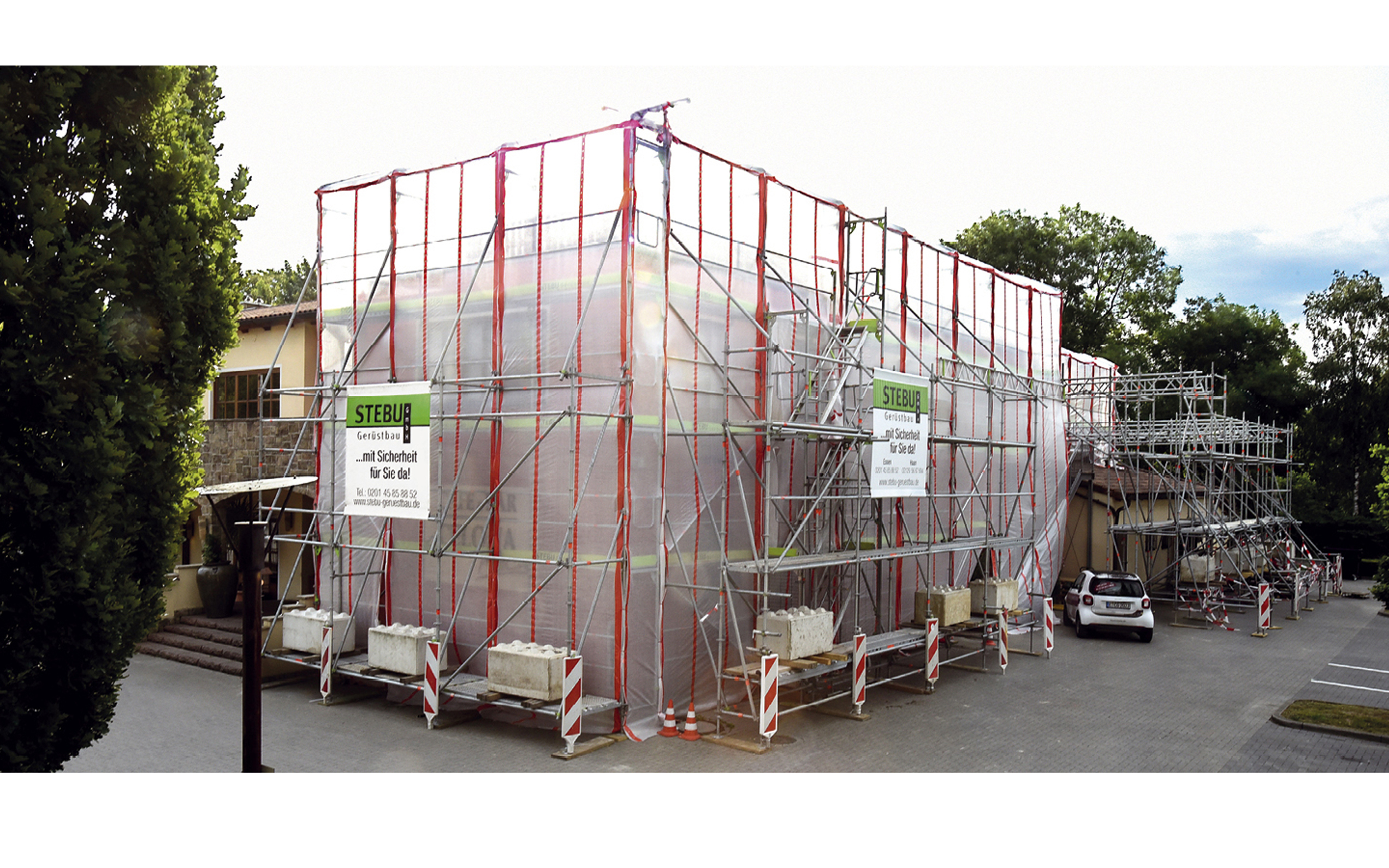„Es gibt kein Bauwerk, das wir nicht einrüsten können“, betont der Geschäftsführer. Alle Varianten des Fassadengerüstbaus sind Standard. Rollgerüste für den Innen- und Außeneinsatz sowie Raumgerüste – selbst in Kirchen, Konzerthäusern und Schwimmbädern – sind kein Problem. Zudem können die Fachleute der STEBU GmbH Sonderkonstruktionen nach individuellem Kundenbedarf errichten. Das Spektrum umfasst unter anderem Überbrückungen, Fußgängerüberwege, Auskragungen außerhalb der Regelausführungen, Traggerüste, Hängegerüste und Fluchttreppentürme. „Wir haben für eine Kanalbaufirma einen Treppenturm als Hängegerüst über 24 Meter abgehängt“, erinnert sich Buiting. „Auch Gerüste an über 100 Meter hohen Gebäuden sind uns möglich. Allerdings muss die Konstruktion bei solchen Höhen von einem Statiker berechnet und extern freigegeben werden.“ Natürlich spielt Sicherheit im Gerüstbau eine entscheidende Rolle. STEBU bietet für Dacharbeiten eine Flachdachabsicherung an. Mit einem System des Gerüstherstellers Layher wird nur auf dem Flachdach ein sicherndes Gerüst errichtet. Für den Passanten-, Umwelt- und Lärmschutz steht das Protect-System zur Verfügung. Es besteht aus Aluminium-Fertigbauteilen mit umlaufender Gummilippe, die an das Gerüst gehängt werden und durch die Lippe mit diesem dicht abschließen. Es ist wasser- und schnittfest.