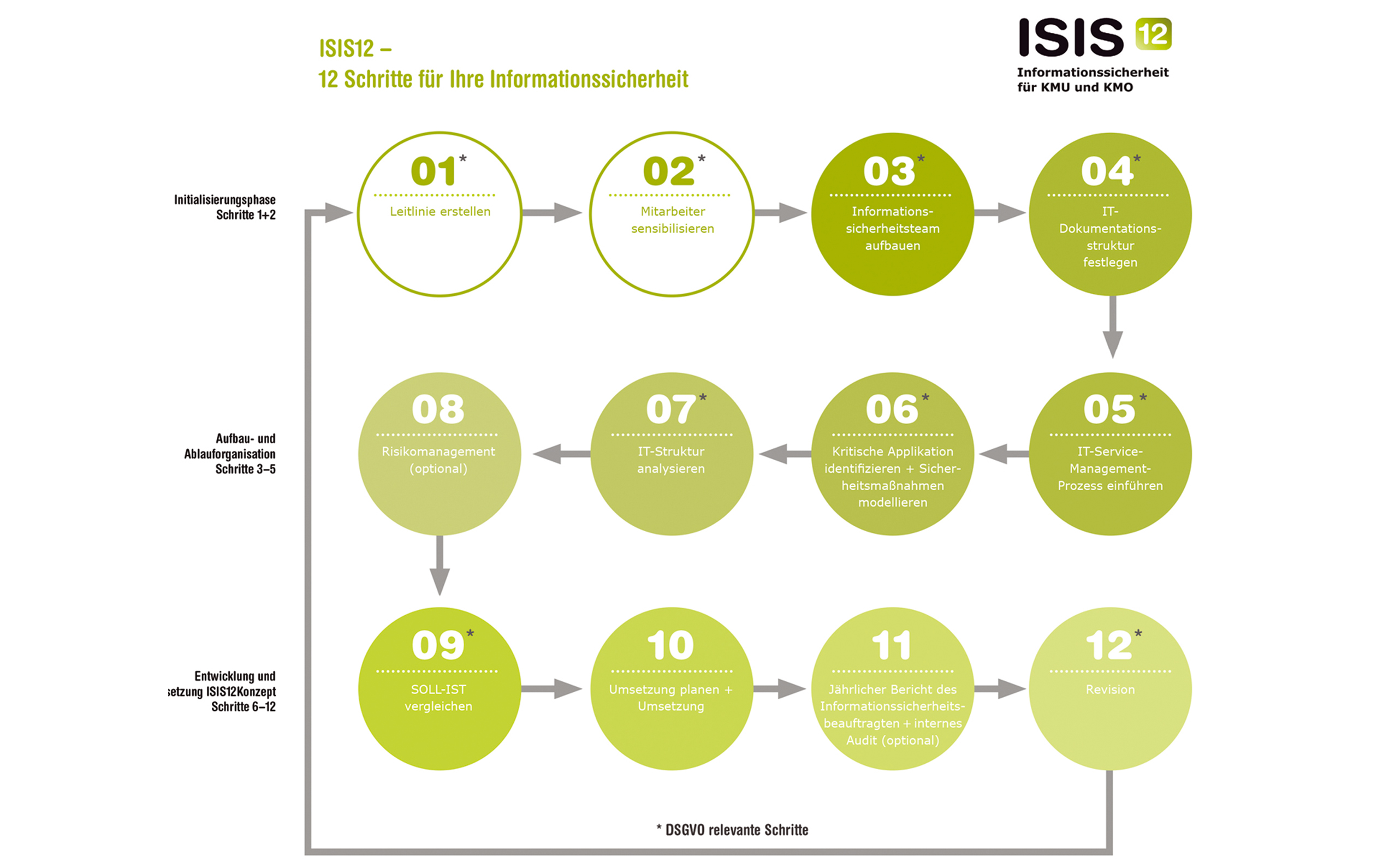 Der Bayerische IT-Sicherheitscluster e.V. hat ein pragmatisches Vorgehensmodell speziell für die Anforderungen von kleinen und mittelgroßen Organisationen und Unternehmen (KMU) konzipiert. ISIS12 liefert einen handlichen Methodenbaukasten, der schnell sichtbare Ergebnisse liefert und durch eine externe Prüfstelle zertifiziert werden kann. Als weiterer Mehrwert ist hier zudem ein Modul für die Konformität zu Datenschutzanforderungen integriert. Das Vorgehensmodell ist in zwölf aufeinander aufbauende Schritte und drei Phasen gegliedert. Dadurch erhält der Anwender fachliche Orientierung, welche Aufgaben noch zu erledigen sind.