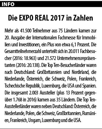 Die Immobilienwirtschaftmesse Expo Real, die Anfang Oktober in München stattfand, toppte alle bisherigen Rekorde: 2.003 Unternehmen, Städte und Regionen aus 35 Ländern stellten aus – 13 Prozent mehr als im Vorjahr. Die Stimmung in der Branche ist positiv und gleichzeitig achtsam. Auch in diesem Jahr war die Wirtschaftsförderung Metropole Ruhr wieder mit dabei, um die Region zu repräsentieren. Mit eigenen Ständen am Gemeinschaftsstand vertreten waren die Städte Bochum, Bottrop, Dortmund, Duisburg, Essen, Gelsenkirchen, Hamm, Hagen, Herne, Mülheim, Oberhausen und die Kreise Recklinghausen und Unna. Hinzu kamen 101 Unternehmen, die als Partner der Region den gemeinsamen Messeauftritt als Plattform zur Vermarktung ihrer Projekte und Dienstleitungen nutzten. „Die Expo Real 2017 bestätigt mit einer Rekordbeteiligung ihre Position als führender Branchentreffpunkt in Europa: 2.003 Aussteller bedeuten ein Plus von 13 Prozent gegenüber dem Vorjahr, mehr als 41.500 Teilnehmer ein Plus von etwa 6,1 Prozent“, berichtet Klaus Dittrich, Vorsitzender der Geschäftsführung der Messe München. „Die Rekordbeteiligung spiegelt die starke Entwicklung der Immobilienwirtschaft wider. Die Messeteilnehmer sind sich zugleich der vielfältigen Einflussfaktoren auf den bisherigen Boom bewusst.“