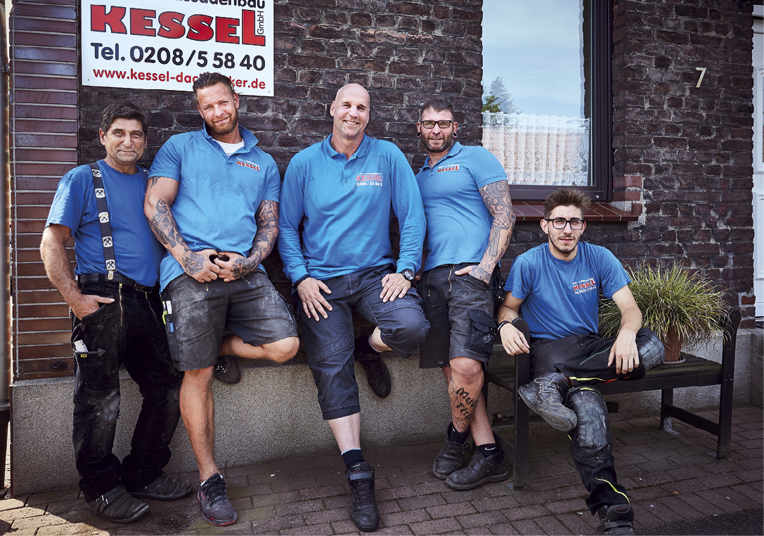 Der Dach- und Fassaden-bauer Kessel aus Mülheim an der Ruhr bietet seinen Kunden das gesamte Spektrum des klassischen Dachdeckerhandwerks und im Fassadenbau an. So unterstützt das Unternehmen Kunden beim Bau, der Reparatur, der Dämmung und Wartung aller Dacharten vom Steildach über das Flachdach bis hin zum begrünten Dach. „Wir würden uns gerne auf Dachbegrünungen spezialisieren“, sagt Marcus Kessel, der den Familienbetrieb leitet. Das sei zwar teurer als ein konventionelles Dach, aber ökologisch nachhaltiger und es amortisiere sich über die Jahre für den Bauherren. Die meisten Kunden des Betriebs kommen aus Essen, Mülheim an der Ruhr, Oberhausen und Duisburg. Das Familienunternehmen arbeitet vor allem für Privatkunden, aber auch für Hausverwaltungen. „Wichtig ist uns bei allen Projekten, dass wir auf eigene Rechnung arbeiten. Wir sind nicht als Sub-Unternehmen für andere tätig“, sagt Kessel, der den Betrieb im Jahr 2012 von seinem Vater übernommen hat. Die Firma hat sechs Mitarbeiter beschäftigt. Wenn es darum geht, eine Fassade zu bekleiden, ist das Thema Wärmedämmung nach wie vor präsent beim Mülheimer Dach- und Fassaden-Spezialisten. „Jede zweite Nachfrage nach einer Fassade kommt bei uns in Verbindung mit einer Anfrage der KfW-Bank“, so der Inhaber. Wenn es um Fassaden geht, ist Kessel bekennender Schiefer-Fan. „Manche Leute möchten die Fassade streichen. Allerdings muss ein Fassaden-Anstrich alle fünf bis zehn Jahre mit den entsprechenden Kosten für Gerüst und Maler aufgefrischt werden.“ Das sei bei Schiefer, einem Naturprodukt, nicht nötig. Der Familienbetrieb verbaut an Fassaden neben Schiefer auch Platten aus Faserzement. Diese lassen sich in vielen Farben und Strukturen anfertigen. So ist es laut Kessel kein Problem, einer Faserzementplatte beispielsweise die Anmutung einer Holzplanke zu geben.