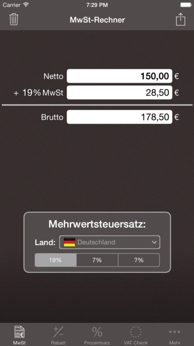 Sie sind als Kaufmann oder Vertriebler tätig, haben regelmäßig mit Netto-Preisen zu tun und möchten wissen, wie viel Sie brutto berechnen müssen? Dann hilft Ihnen der praktische, mobile Mwst-Rechner. Mit dieser App können Sie den Netto- oder Brutto-Betrag basierend auf der Mehrwertsteuer ermitteln. Sie kennen nur den Mehrwertsteuer-Satz und -betrag eines Artikels? Auch hier ist der Mwst-Rechner in der Lage, die jeweils anderen Werte zu ermitteln. Fest hinterlegt sind die Mehrwertsteuer-Sätze von 37 Ländern inklusive Internet-Update für Änderungen der MwSt-Sätze. Zusätzlich dazu bietet die App die Möglichkeit des Druckens eines Quittungs-Formulars direkt aus der App. Auch bietet sich ein Modul an, mit dem man Rabatte oder Prozente berechnen kann. Eine weitere Funktion im Zusammenhang mit der Umsatzsteuer ist der VAT-Check. Über diese Funktion können Sie für Unternehmen in Europa prüfen, ob die angegebene VAT- oder Ust.-ID-Nummer gültig ist. Fazit: Der kleine Buchhalter für die Hosentasche.